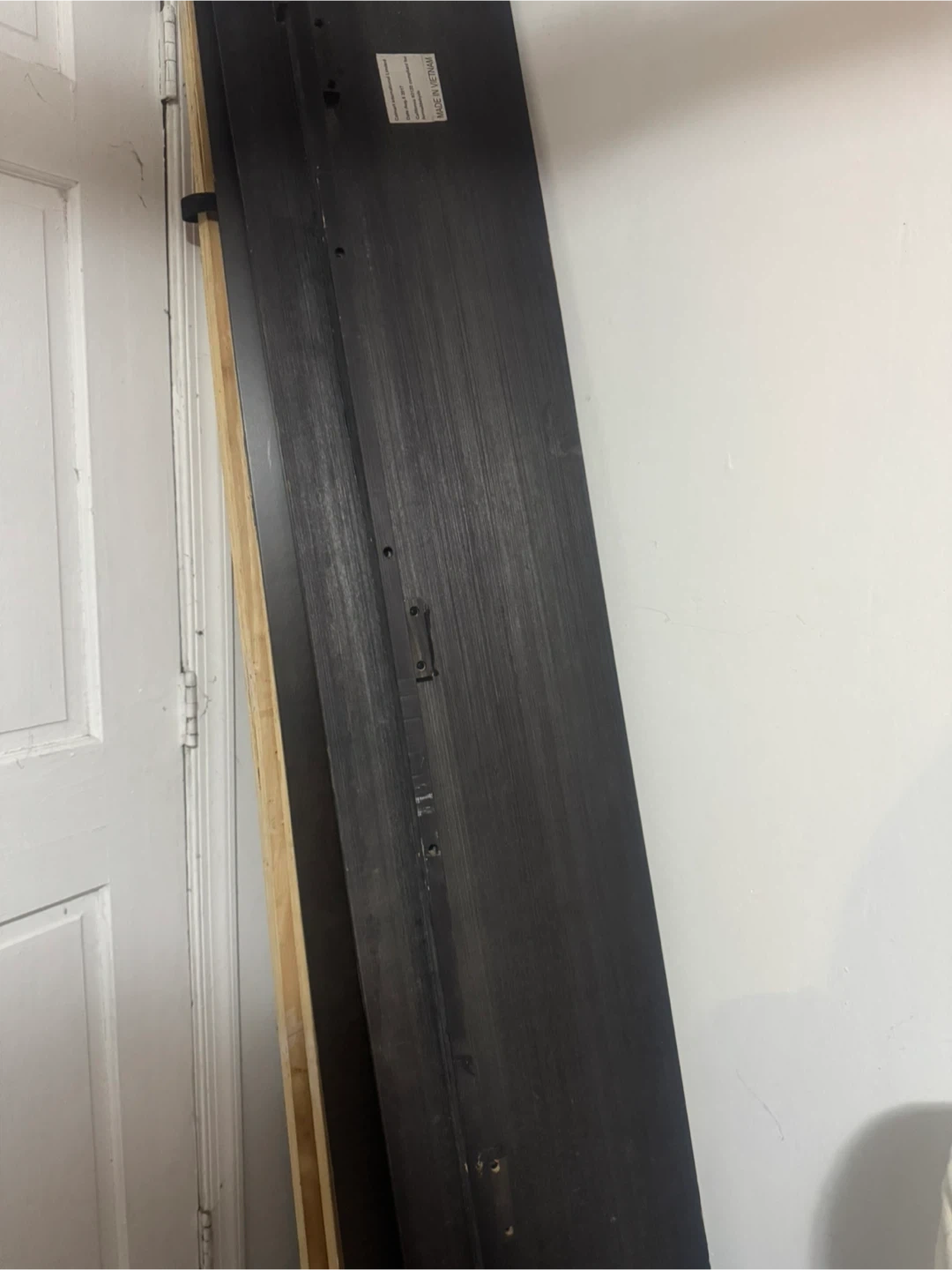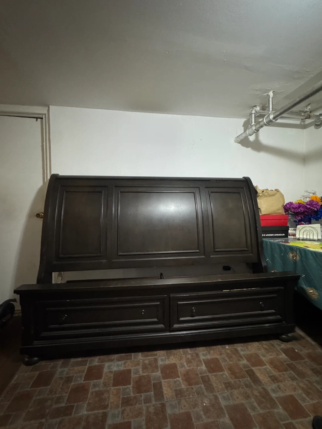 This sleigh bed frame is made of dark wood and features two built-in storage drawers at the footboard. It's compliant with California 93120 for formaldehyde. Made in Vietnam.