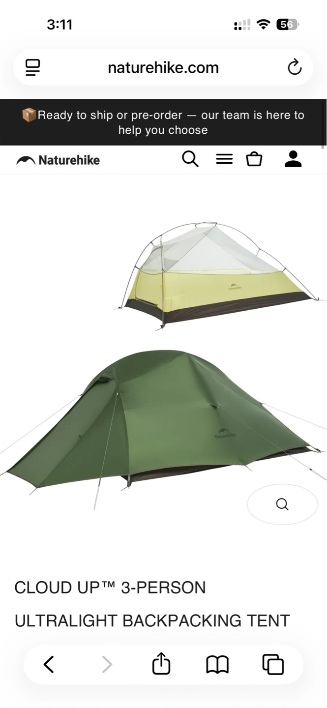 This is a Naturehike Cloud Up 3-person ultralight backpacking tent. It's suitable for backpacking trips where weight is a concern. Offers shelter for up to three people.
