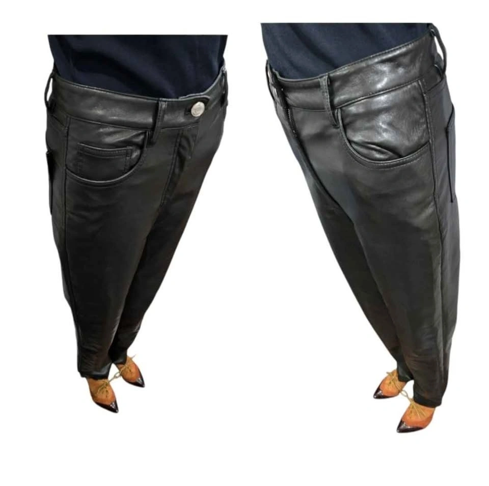 They’re made with innovative vegan leather that looks and feels like the real thing. They have an authentic drape and a soft sheen. Zip fly with tack button closure. Topstitch detailing throughout. Rise: High. Leg: Straight. Length: Full — Intended to hit at the ground while wearing flat shoes.