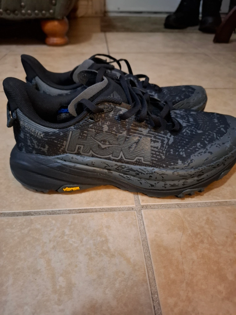 Selling a pair of Hoka Speedgoat 5 GTX trail running shoes in great condition! These are perfect for hitting the trails, offering excellent grip with the Vibram soles and waterproof protection thanks to the GORE-TEX membrane. They're a size 9.5 US.