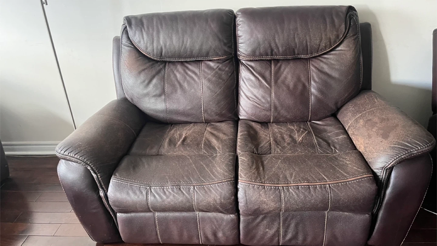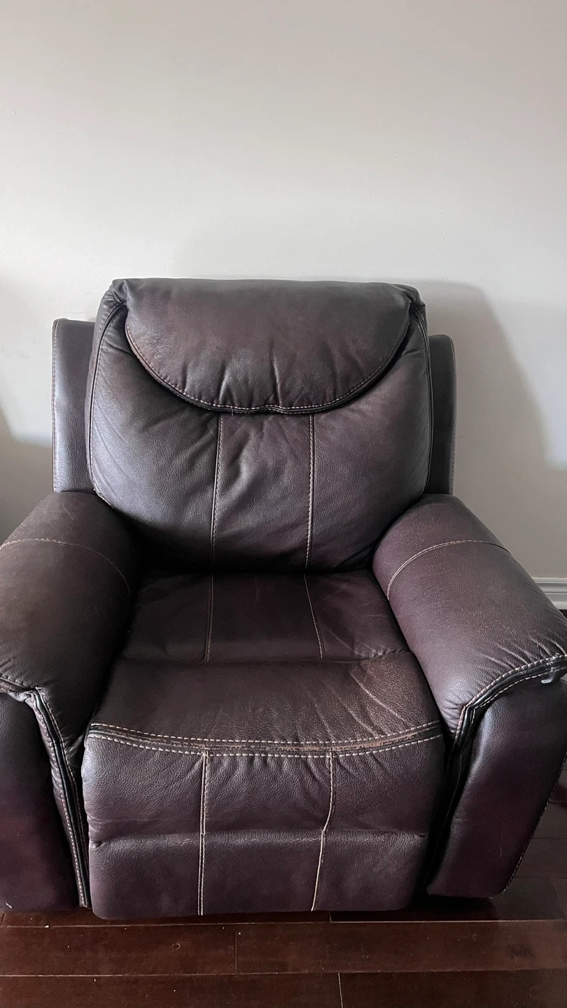 This is a set of brown leather reclining furniture. Includes a three-seater sofa, a loveseat, and an armchair. Made with a durable leather material. These pieces would fit well in a family room or den.