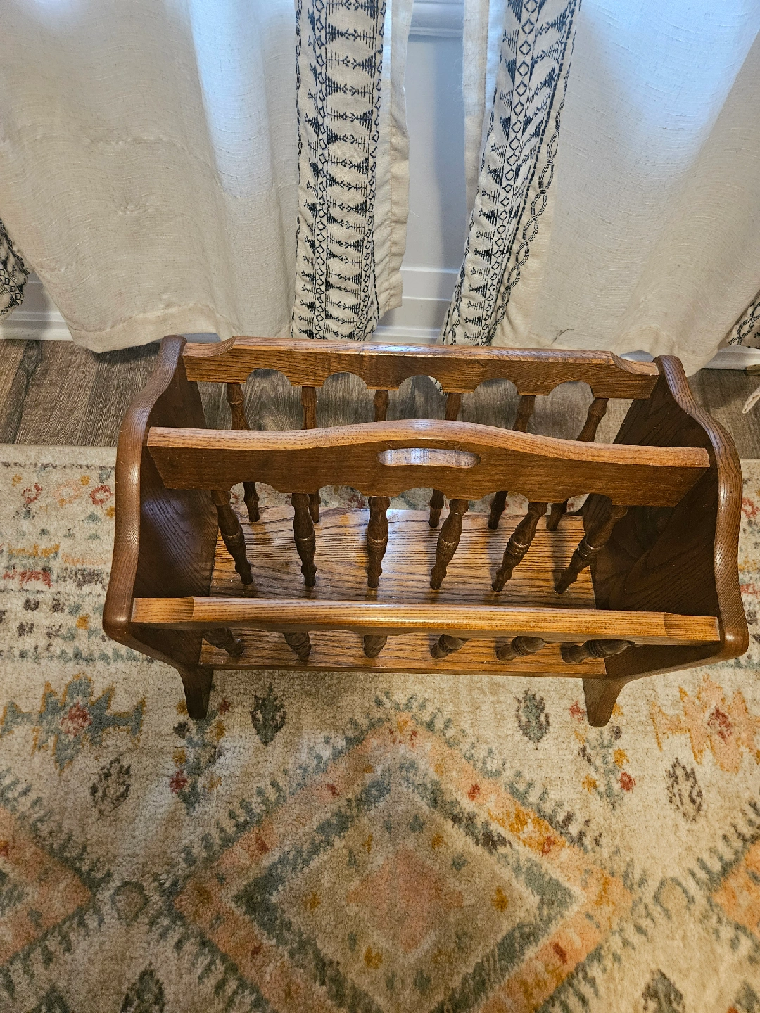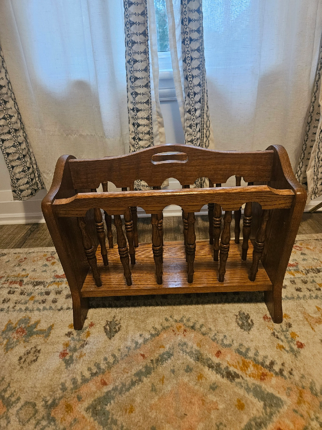 Selling a lovely solid wooden magazine rack. It's in excellent shape and perfect for keeping your reading materials organized and tidy. It has a nice, classic look that would fit well in any living room or study. It's ready to find a new home!
