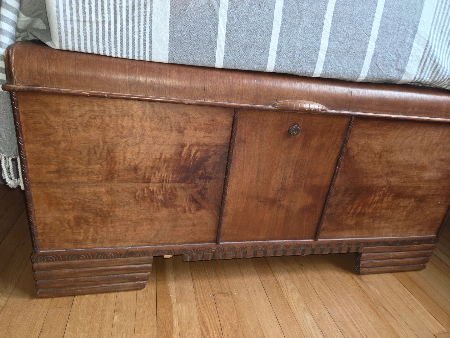 Superbe coffre ancien en bois avec des détails sculptés. Parfait pour ranger les jouets ou comme meuble d'appoint. Le bois est en bonne condition, avec une belle patine.