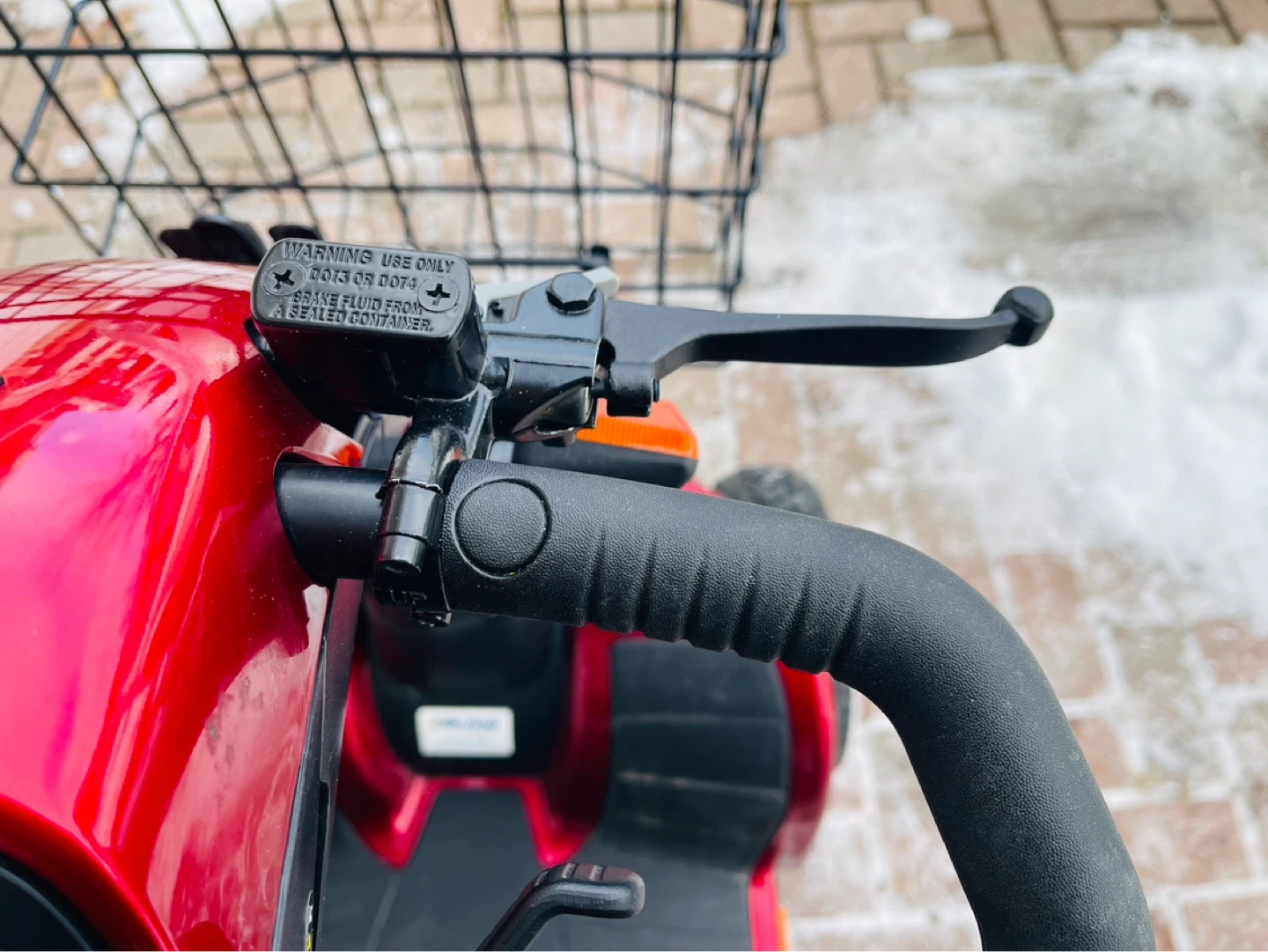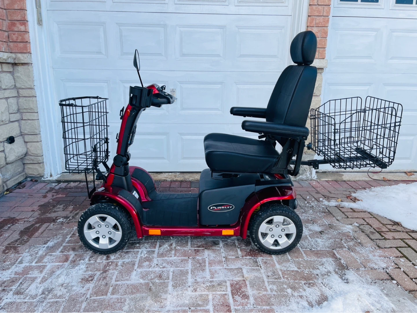 This red mobility scooter has two large front baskets and a rear basket for storage. It offers comfortable seating with adjustable armrests and a headrest. It's well-suited for navigating various terrains.