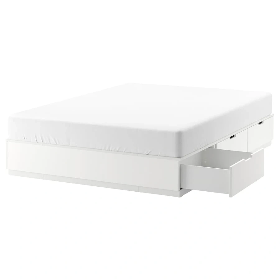 This is an IKEA NORDLI king bed frame with a mattress. It comes in white and features built-in storage drawers.