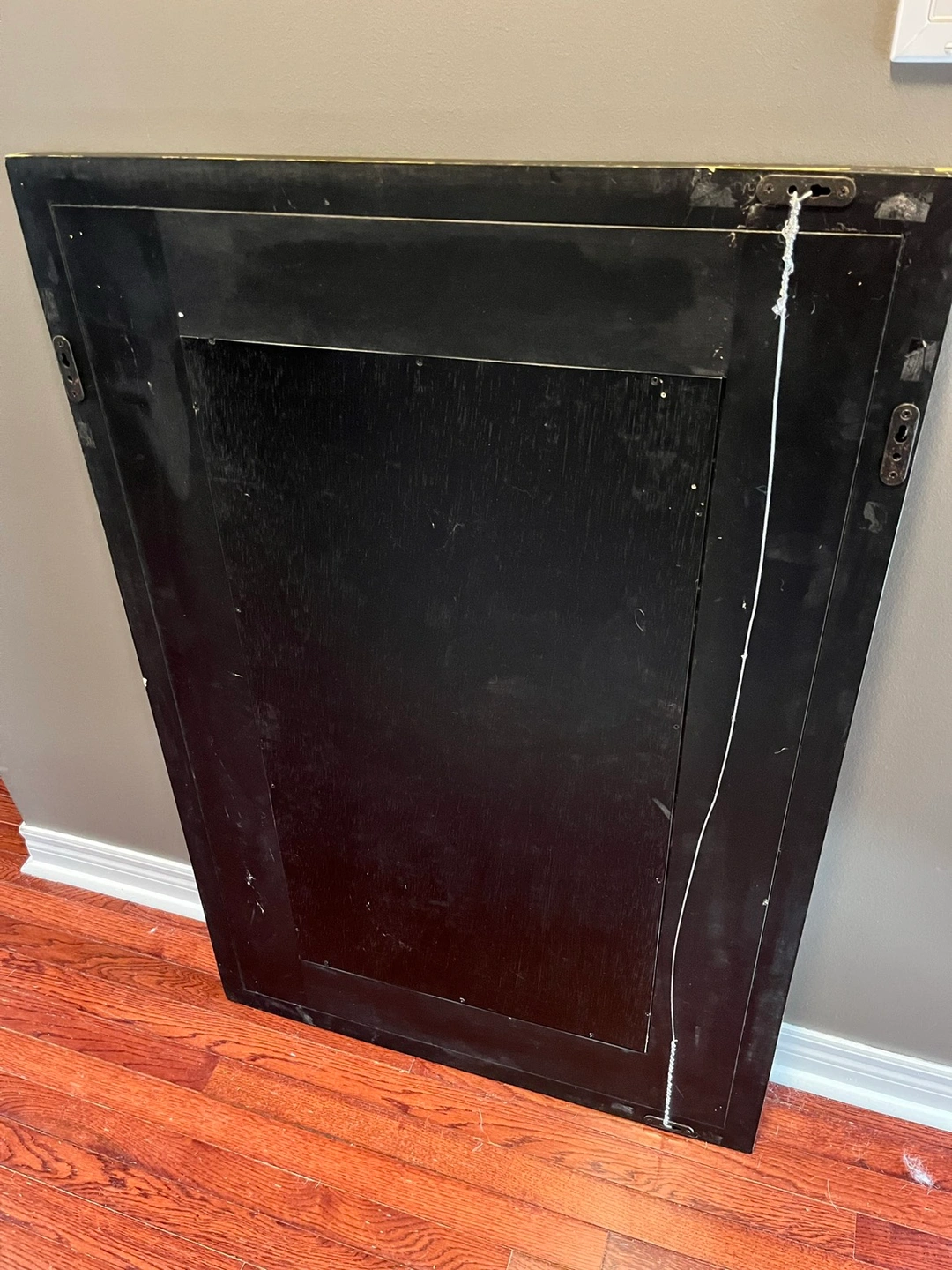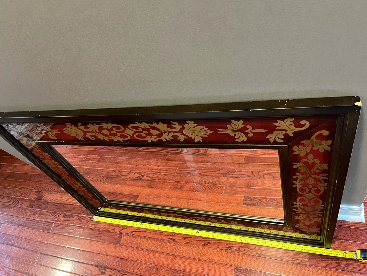 Good used condition mirror with colored glass surround. Chip in one frame corner, and some scratches, could be refinished or placed on top and will not be seen. Glass is all In excellent shape and unmarked. This is large and heavy, 46 x 31 1/4”, can be hung either way. Pick up Brock and Taunton in Whitby.