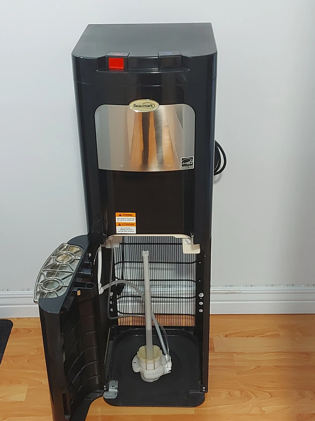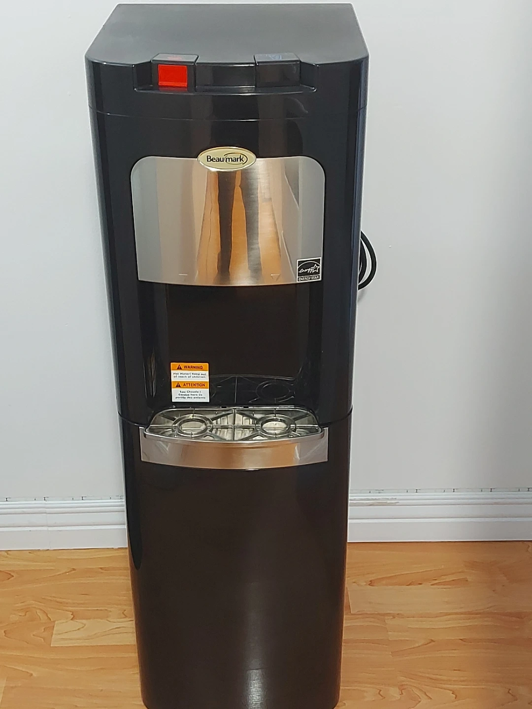 Beaumark water cooler dispenser. Bottom load design. Black colour. Comes with a drip tray and power cord. Energy Star certified. Only used RO water with this unit. Hot and cold works great. Moving out of town and need it gone soon.