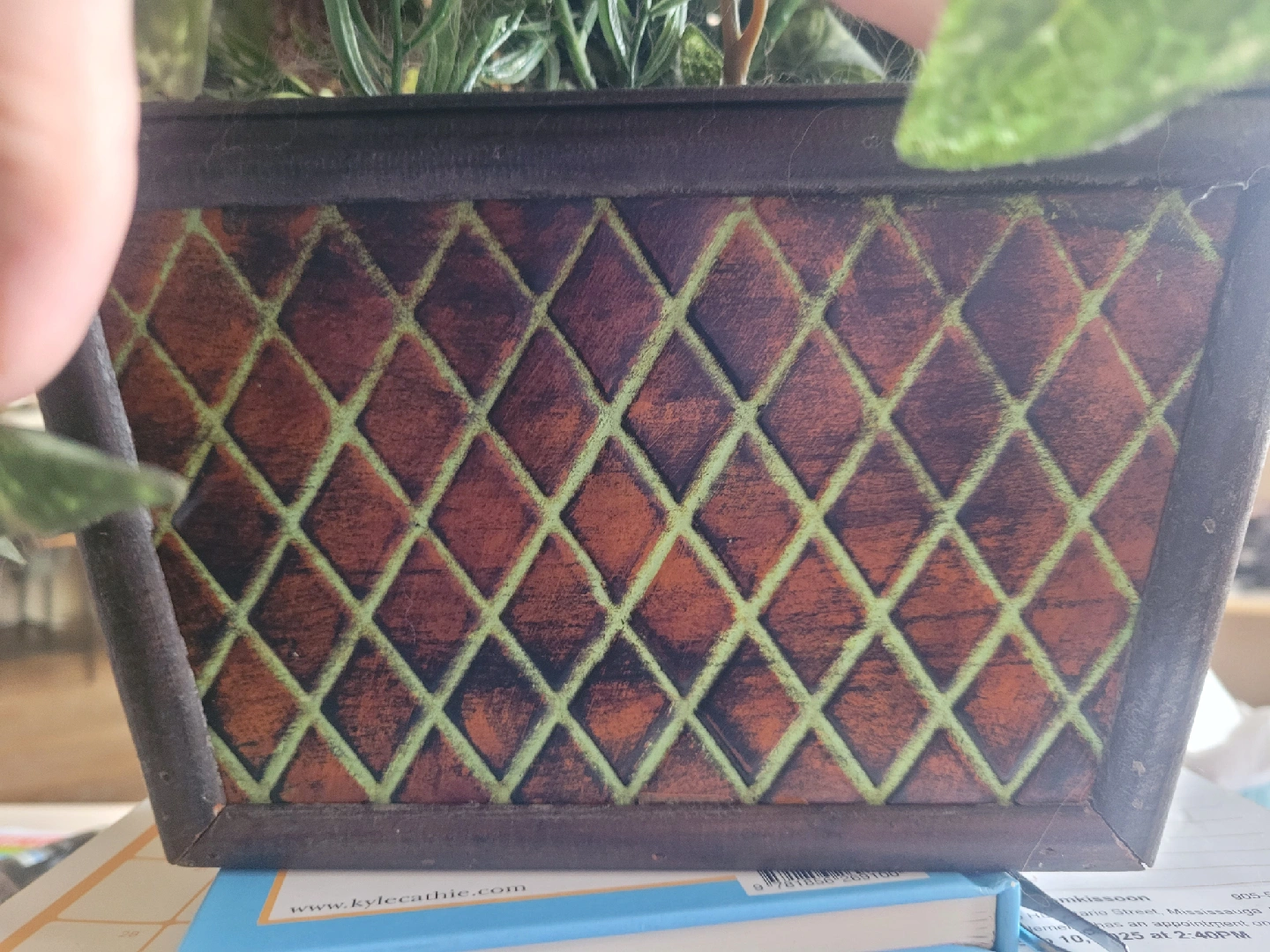 Selling a lovely artificial plant in a decorative pot. It's in great condition and would add a touch of greenery to any room! The pot has a unique diamond pattern.