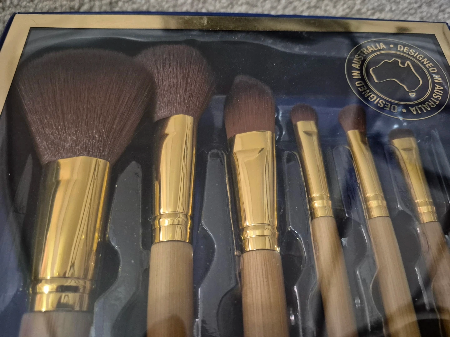 BNIB Never Used Sealed Original Packaging // I'm selling a beautiful and eco-friendly make-up brush set from the Australian brand Ecobeauty. This set includes 6 makeup brushes and a natural bamboo stand. Brushes are made with 100% cruelty-free synthetic soft bristles and bamboo handles with gold-toned ferrules. The stand keeps your brushes neatly stored. Note: This set is no longer available in retail stores so a unique find! Original price $50. Price is firm. Cash Only.