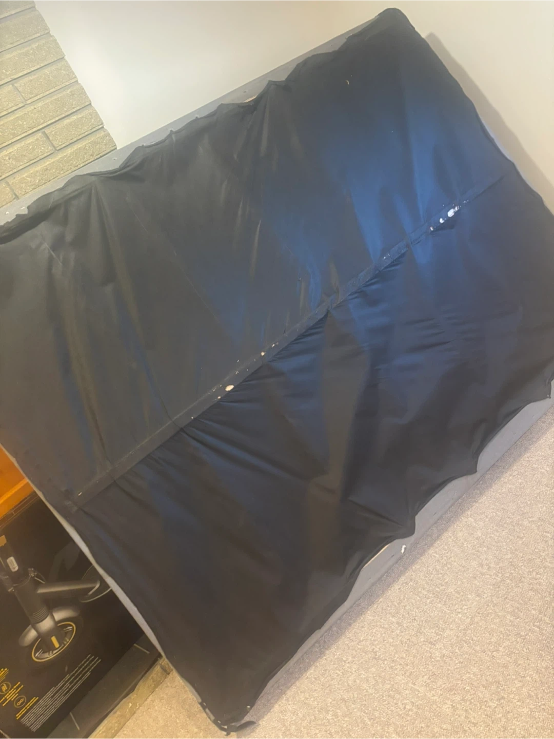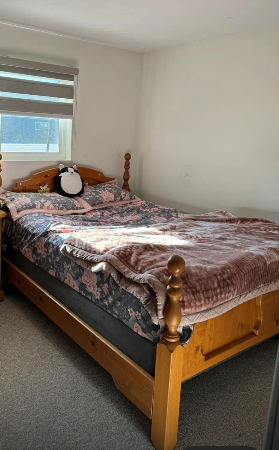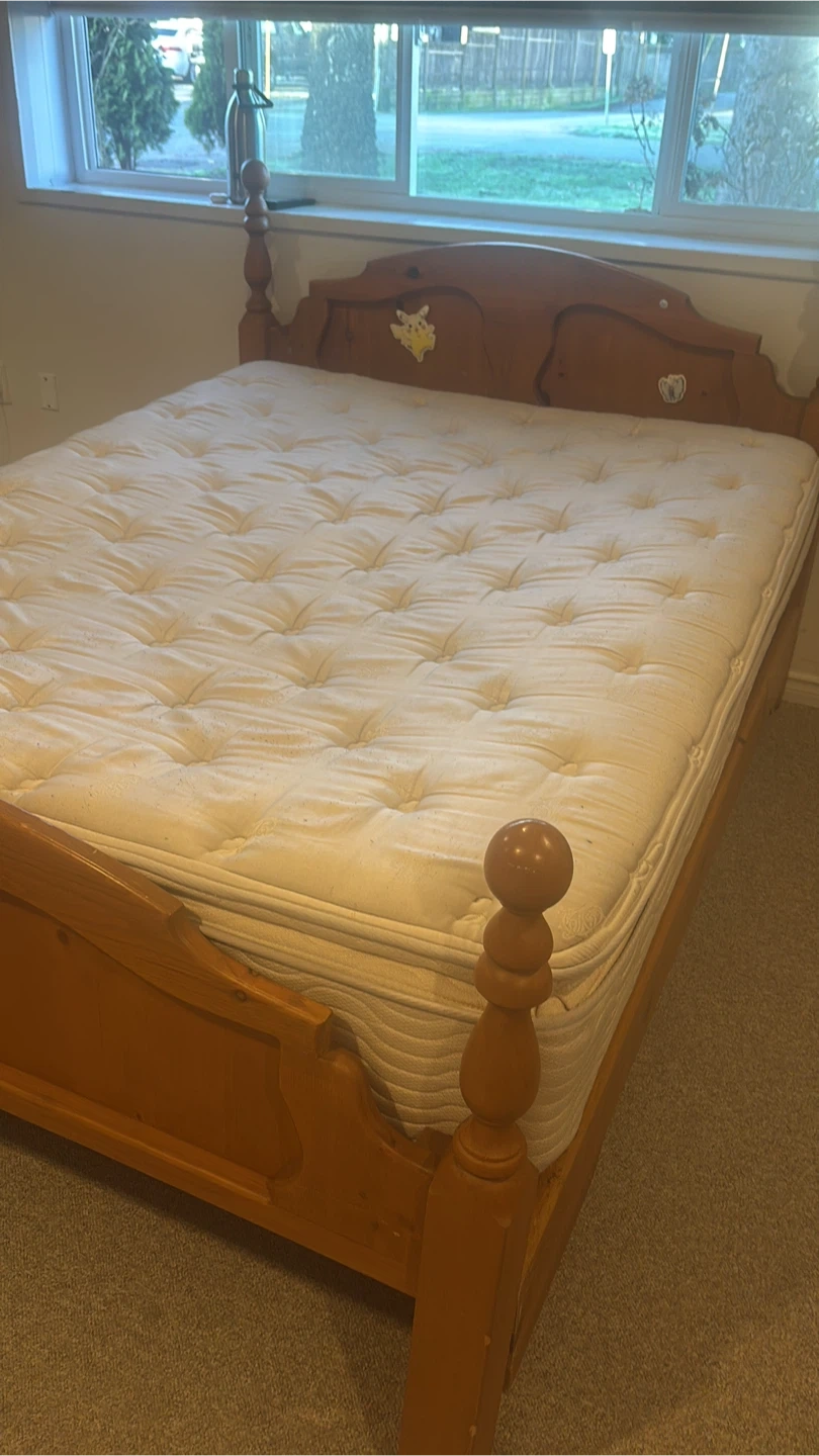 Wooden bed frame with a classic design. Includes a box spring for mattress support. Solid wood construction. Suitable for a master bedroom or guest room.