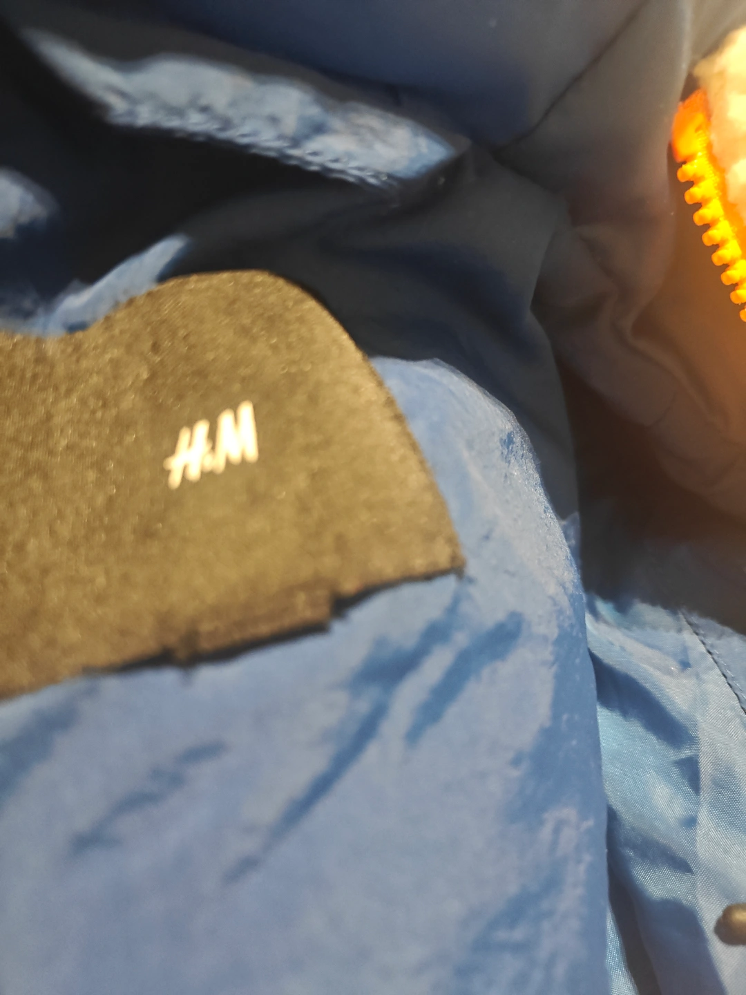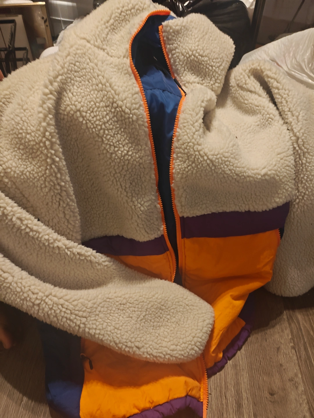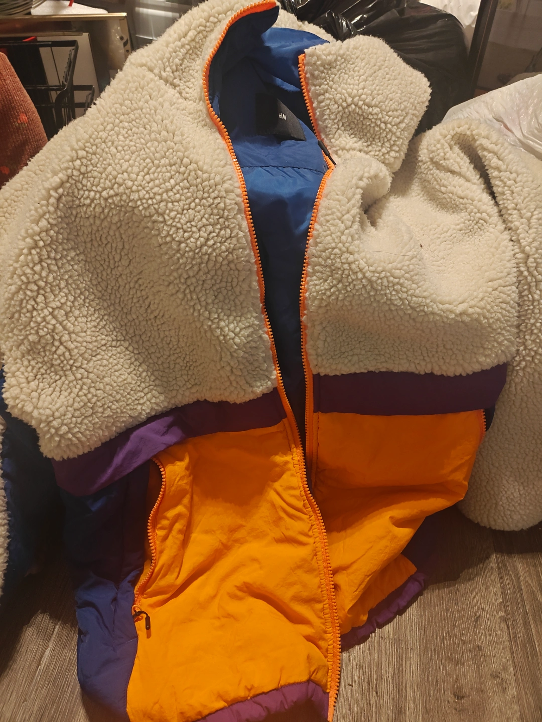 Colour-blocked fleece jacket. Features a cream sherpa-style upper. The lower half features orange and purple panelling. You can use it to keep warm and cozy on cool days. without tag but new