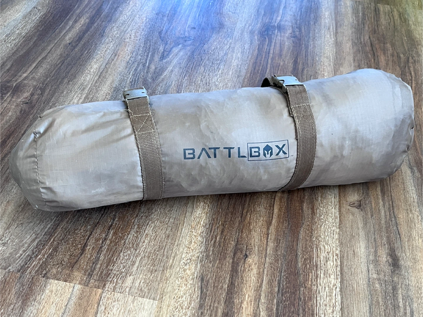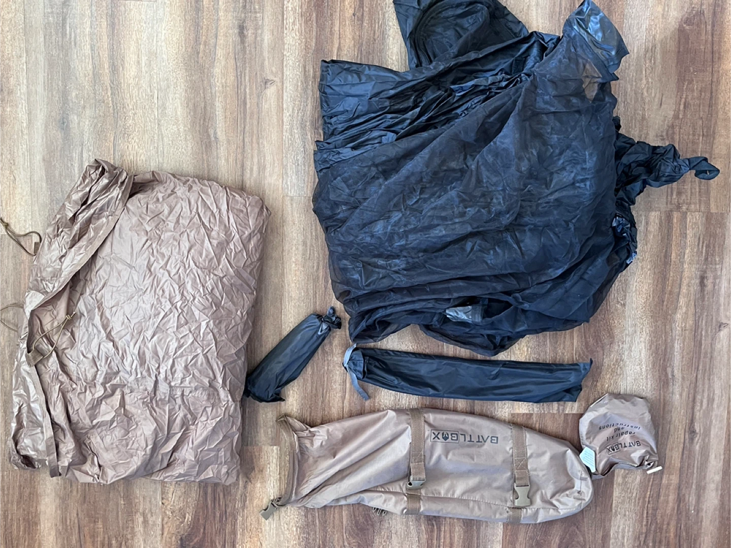 This is a BattleBox 1-person tent. It's made from durable material and includes poles and a carrying bag. Setup is straightforward for quick shelter. Used once.