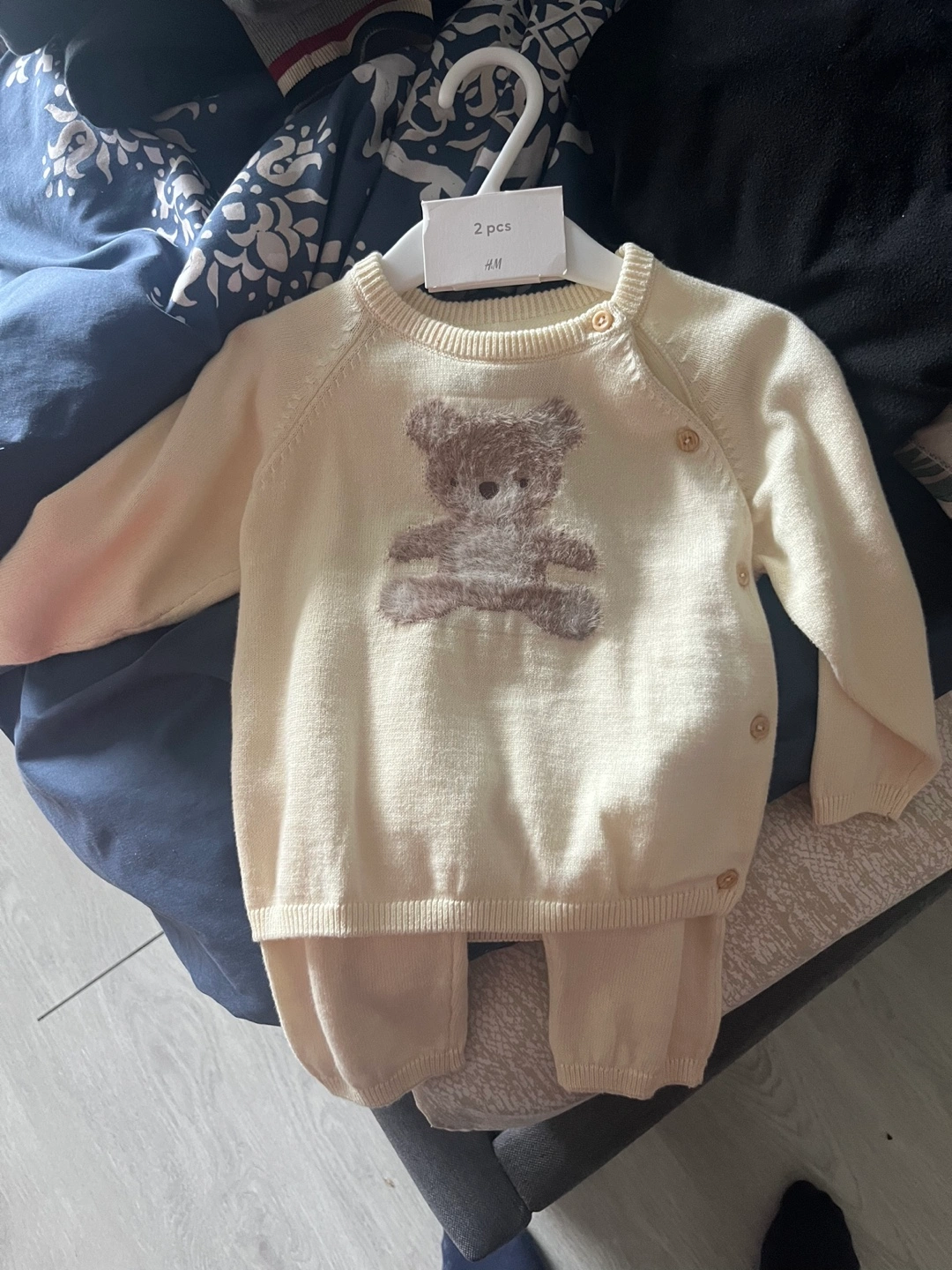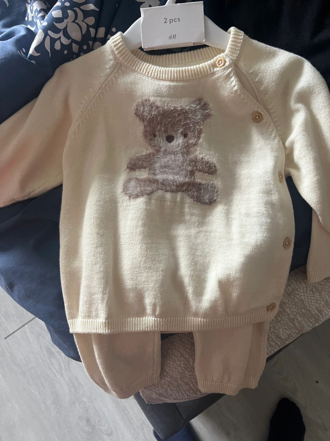 Cream coloured two-piece baby set. Features a knitted sweater with a cute teddy bear design and matching pants. Soft material, perfect for keeping your little one warm.