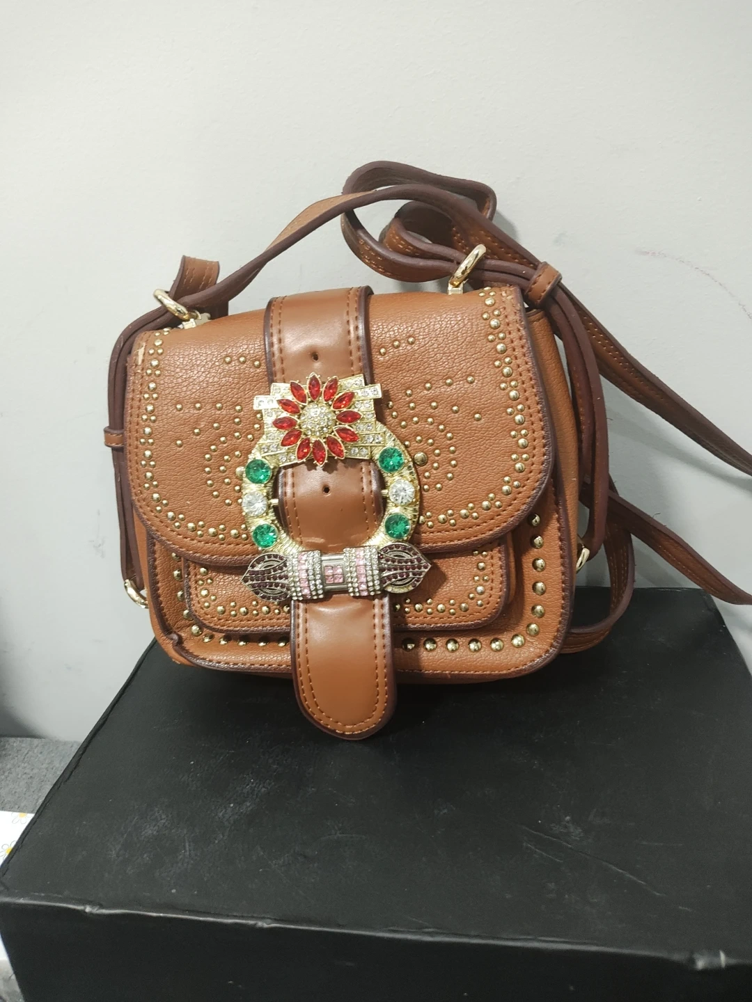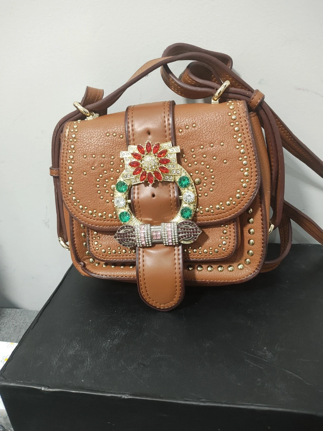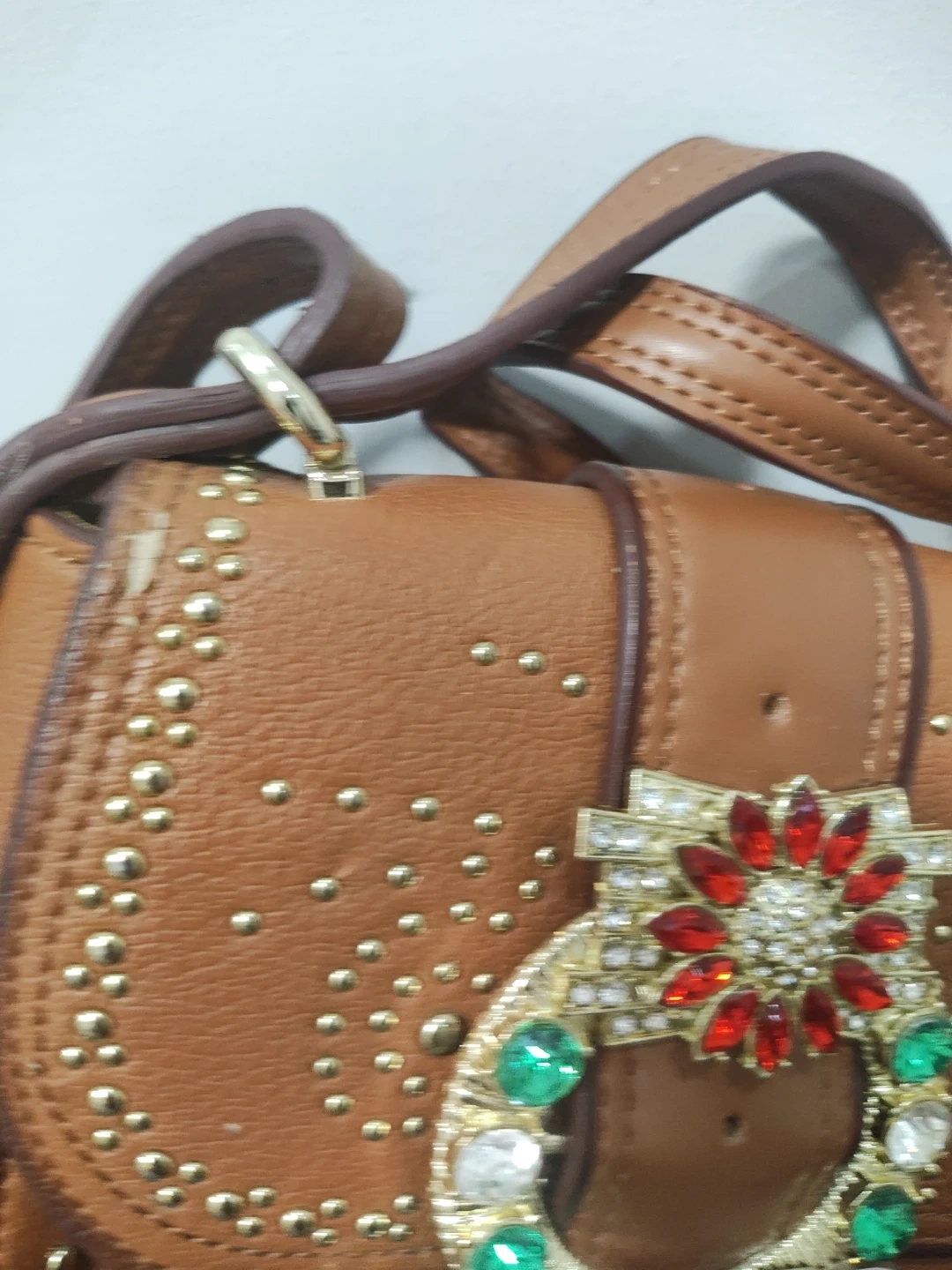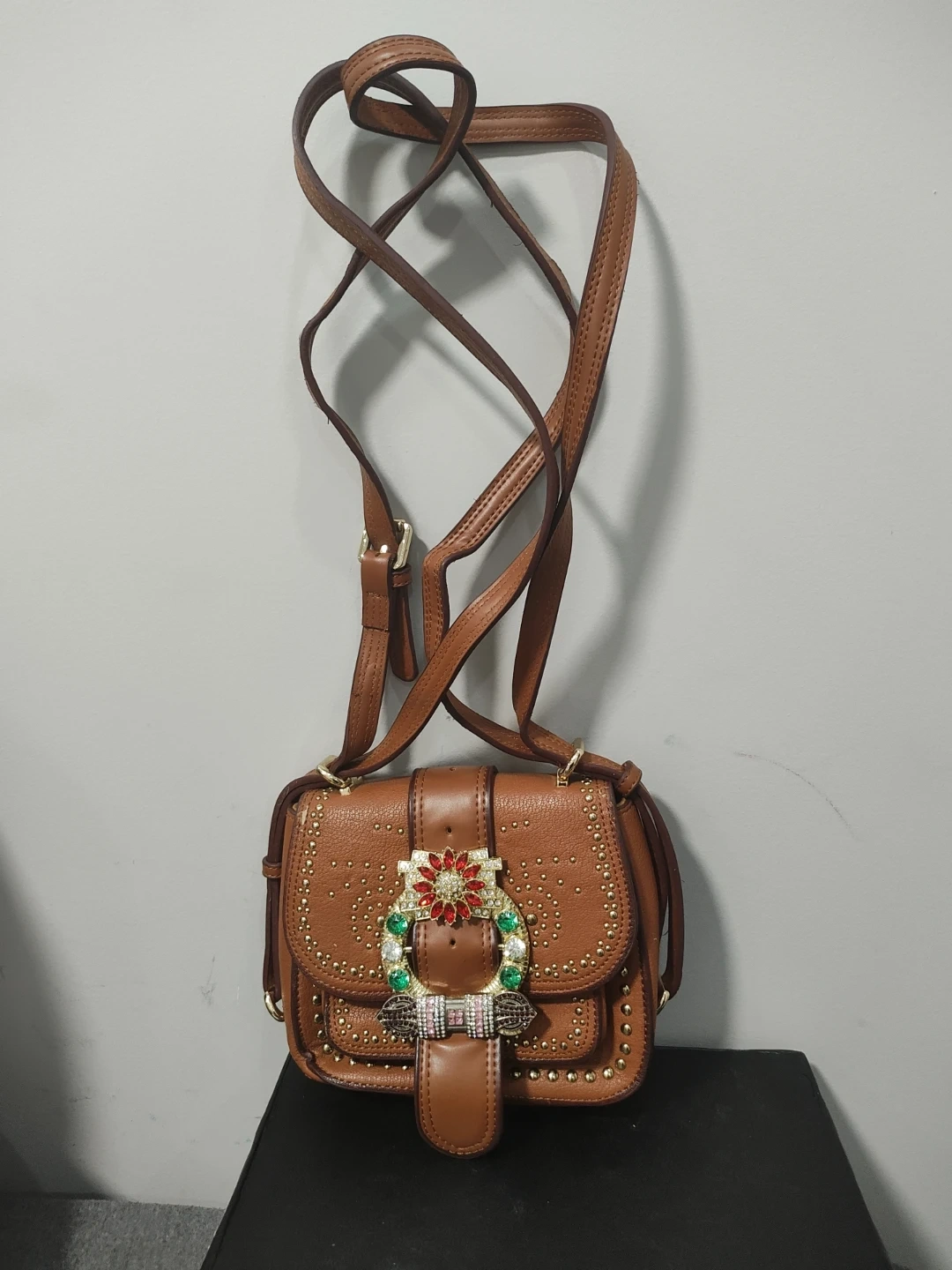 Tan pebble leather crossbody bag with gold stud accents. Features a decorative buckle closure with colourful Swarovski stones. Includes an adjustable strap.