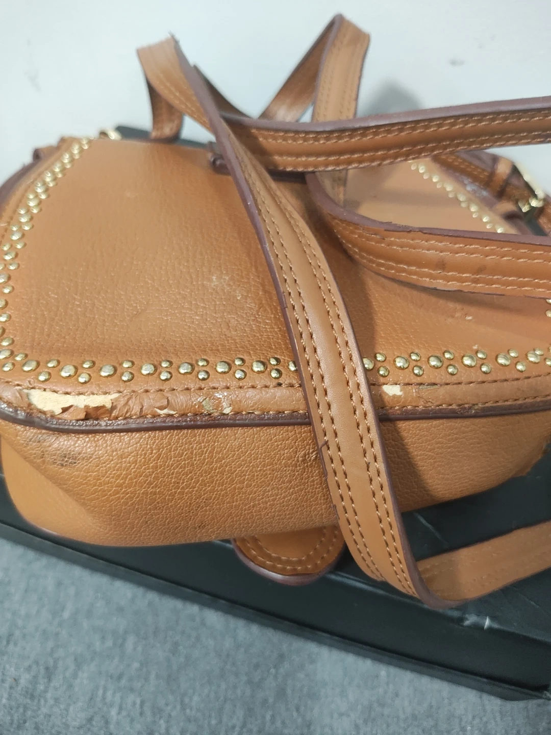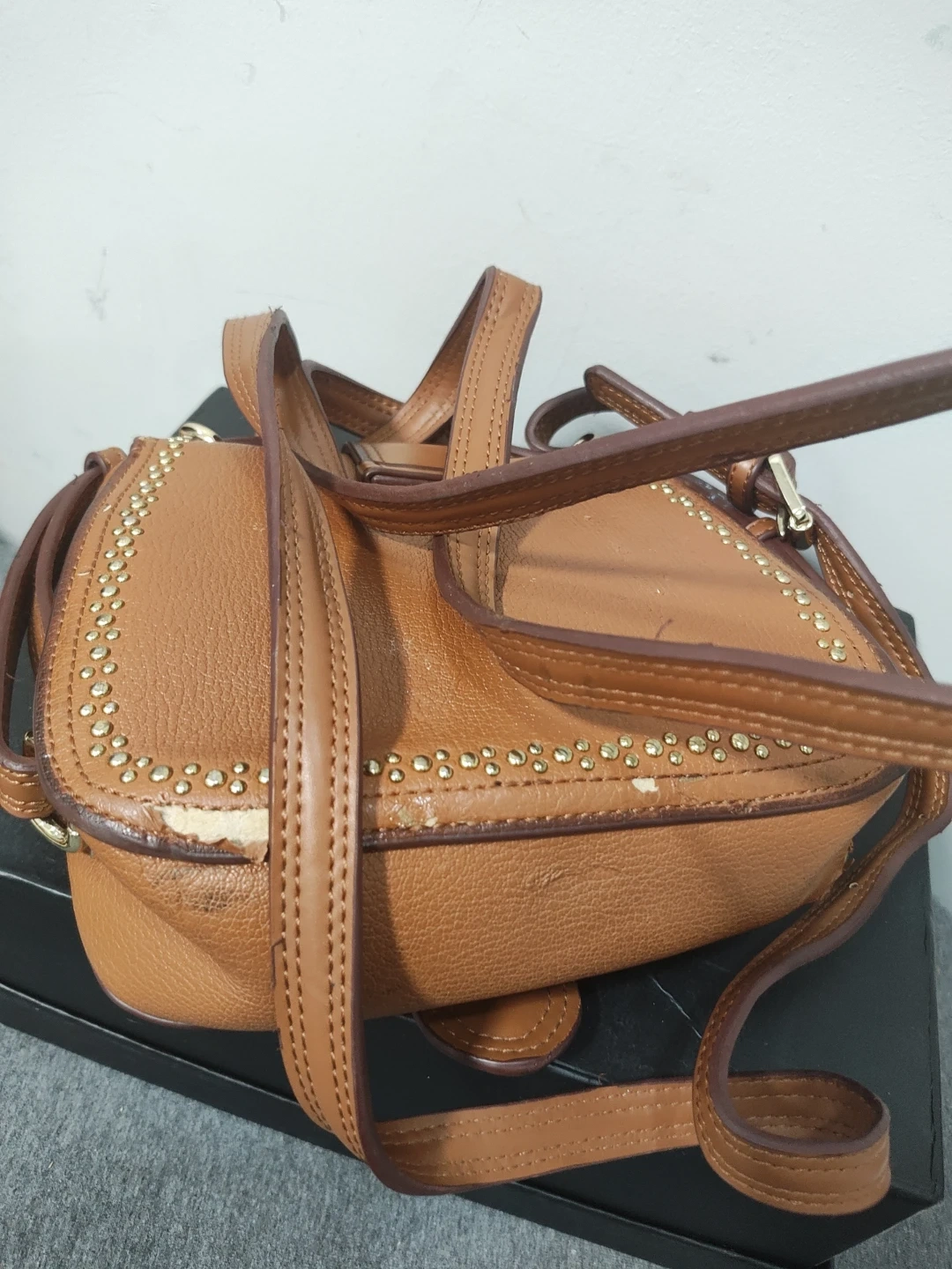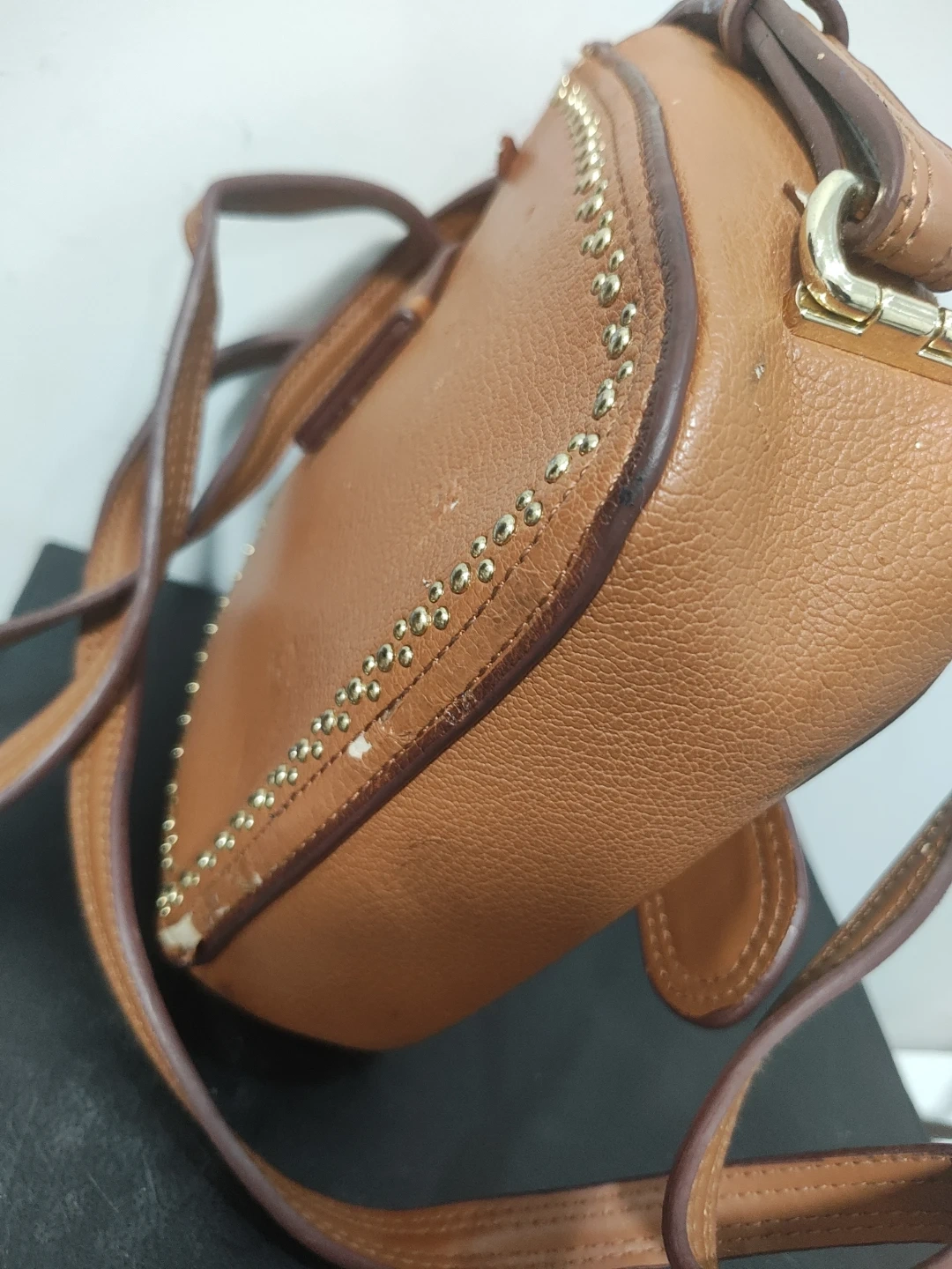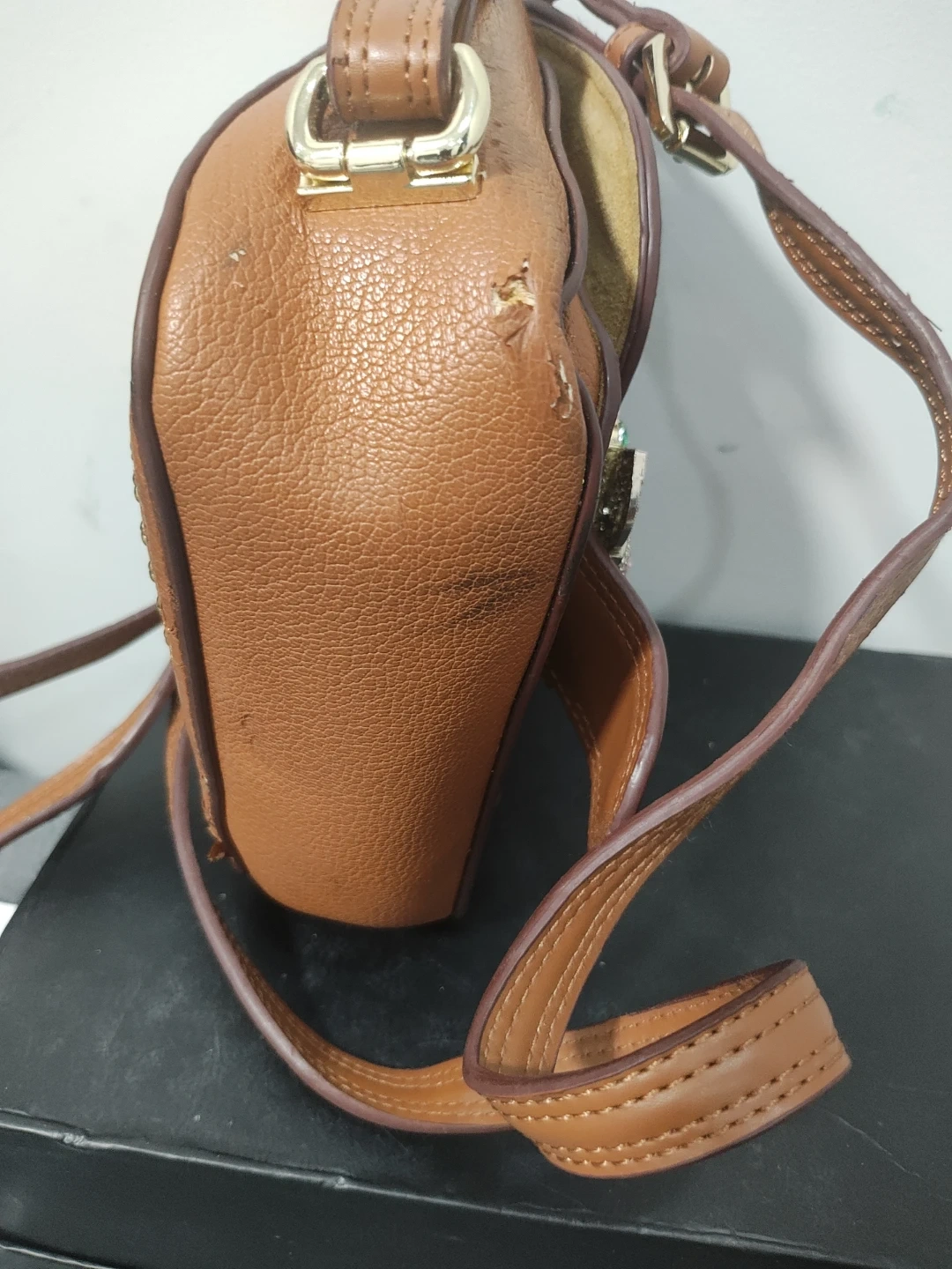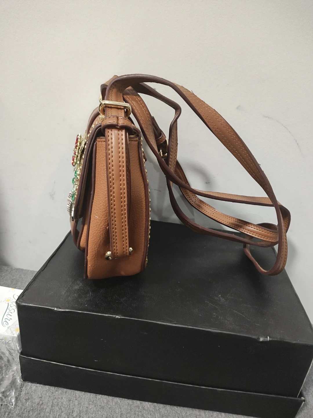Tan pebble leather crossbody bag with gold stud accents. Features a decorative buckle closure with colourful Swarovski stones. Includes an adjustable strap.