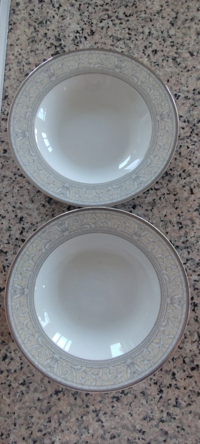 A pair of elegant soup bowls from Joshua Maxwell Studio, Cambridge pattern. These ceramic bowls feature a classic cream base with a detailed border. Dishwasher safe.