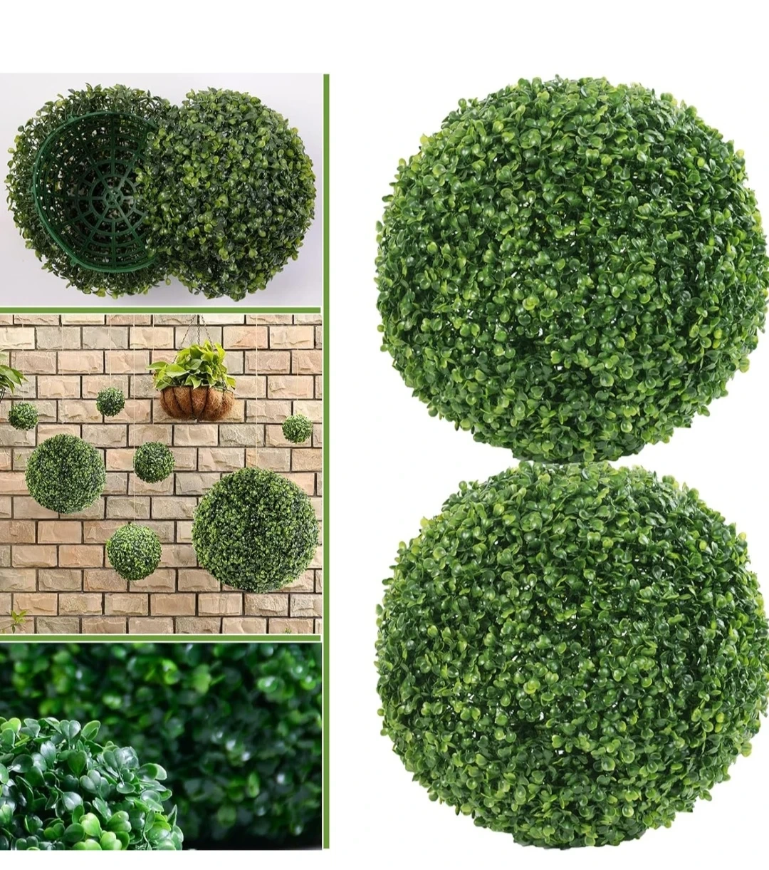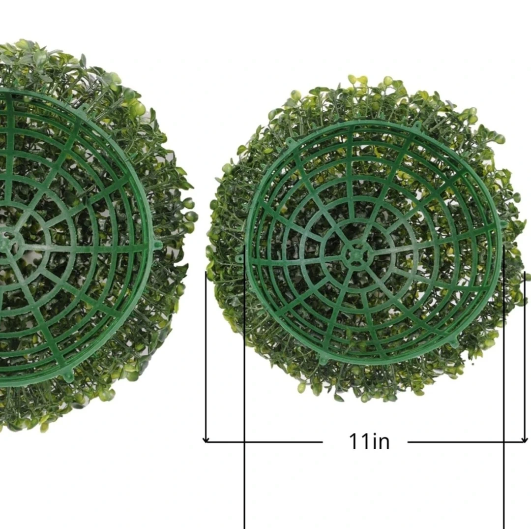 Two green artificial boxwood balls, each approximately 11 inches in diameter. These decorative spheres can be hung for events or used as outdoor decor. Plastic construction.
