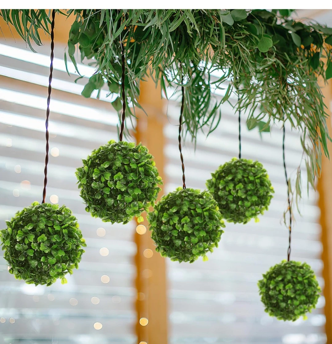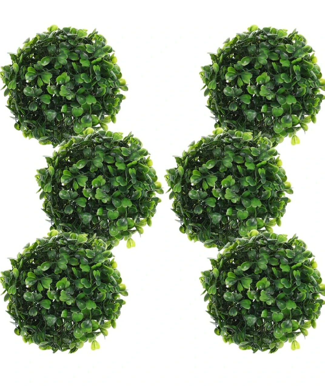 Two green artificial boxwood balls, each approximately 11 inches in diameter. These decorative spheres can be hung for events or used as outdoor decor. Plastic construction.