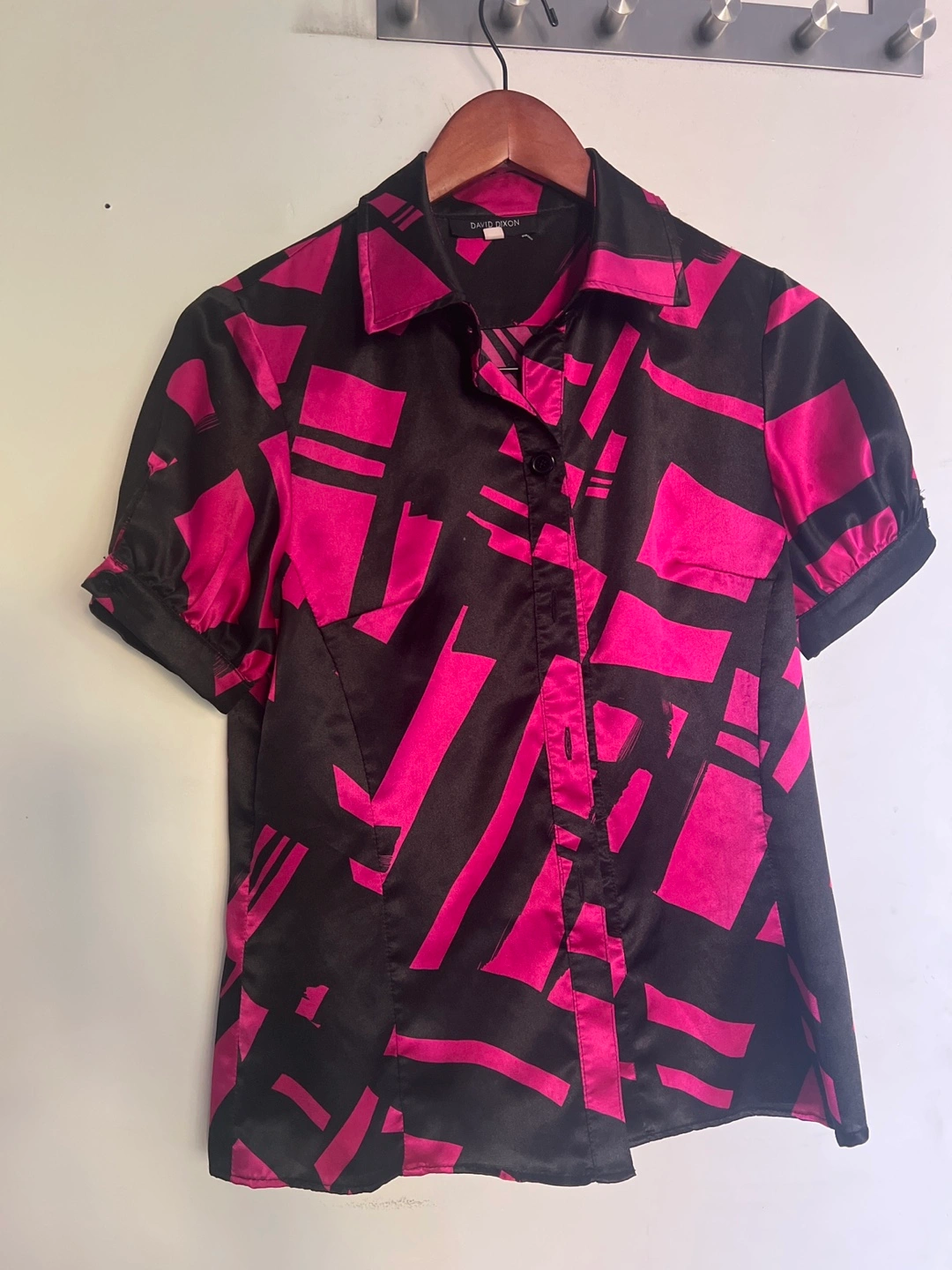 David Dixon size S blouse with a striking pink and black pattern. It's a short-sleeved button-up shirt.