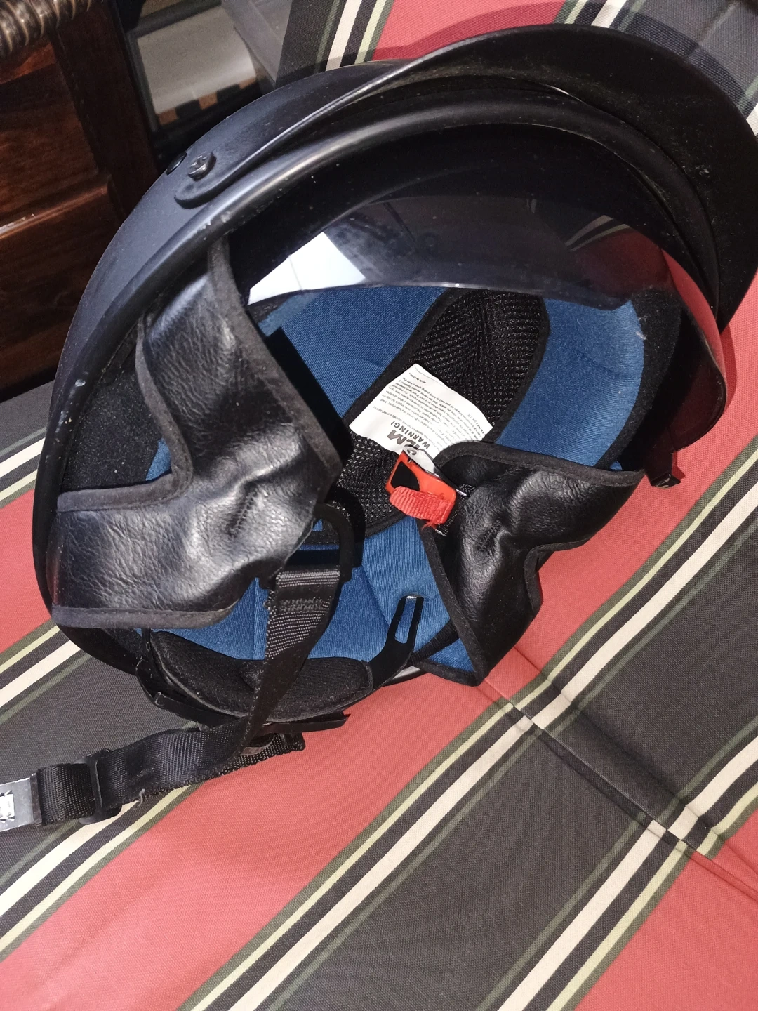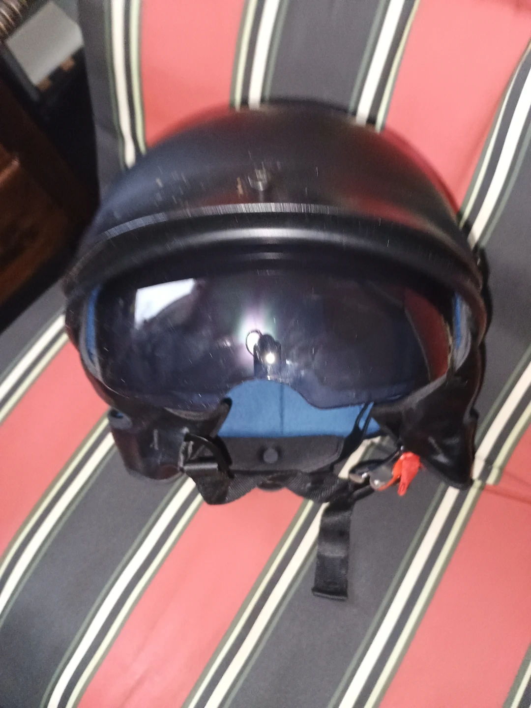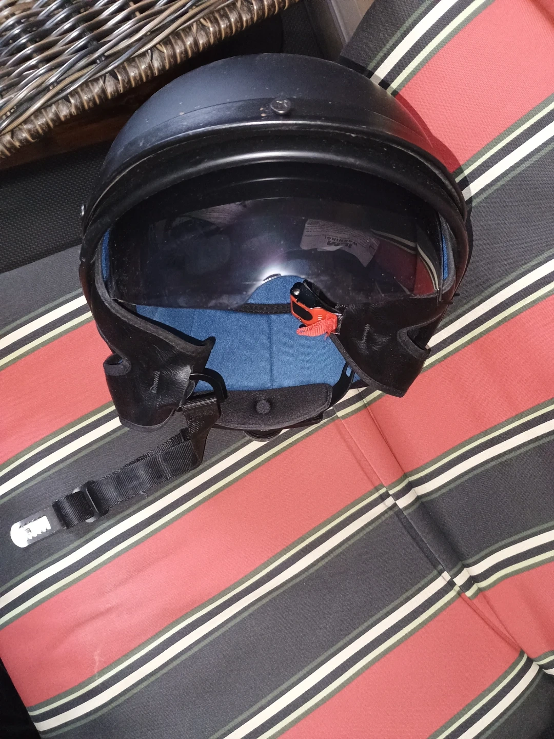 This black motorcycle helmet features a built-in visor for added protection. It has a comfortable blue interior lining and an adjustable chin strap for a secure fit. It's suitable for motorcycle riders looking for basic head protection.