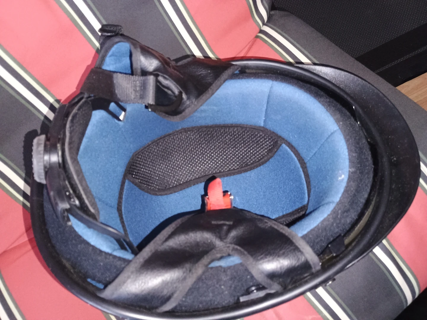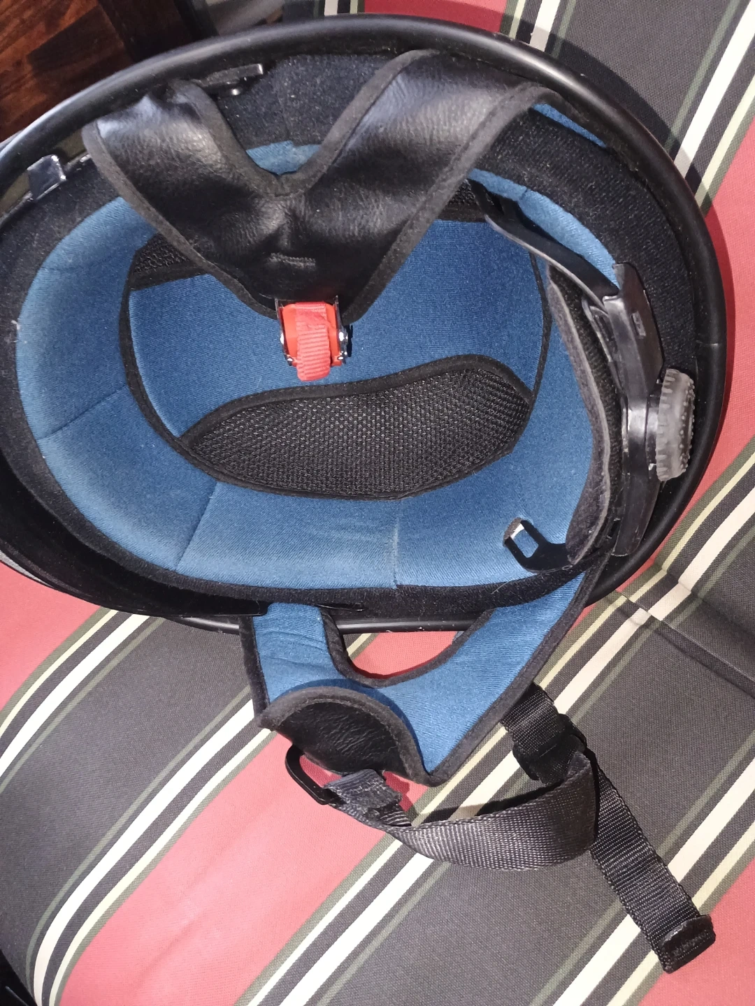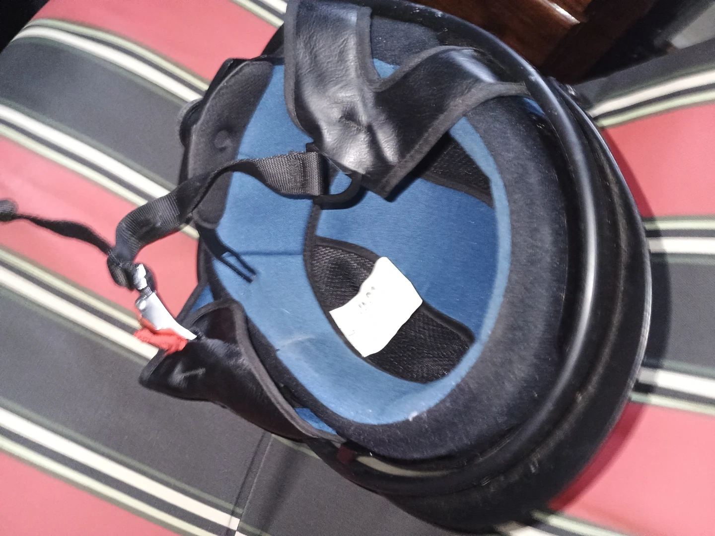 This black motorcycle helmet features a built-in visor for added protection. It has a comfortable blue interior lining and an adjustable chin strap for a secure fit. It's suitable for motorcycle riders looking for basic head protection.