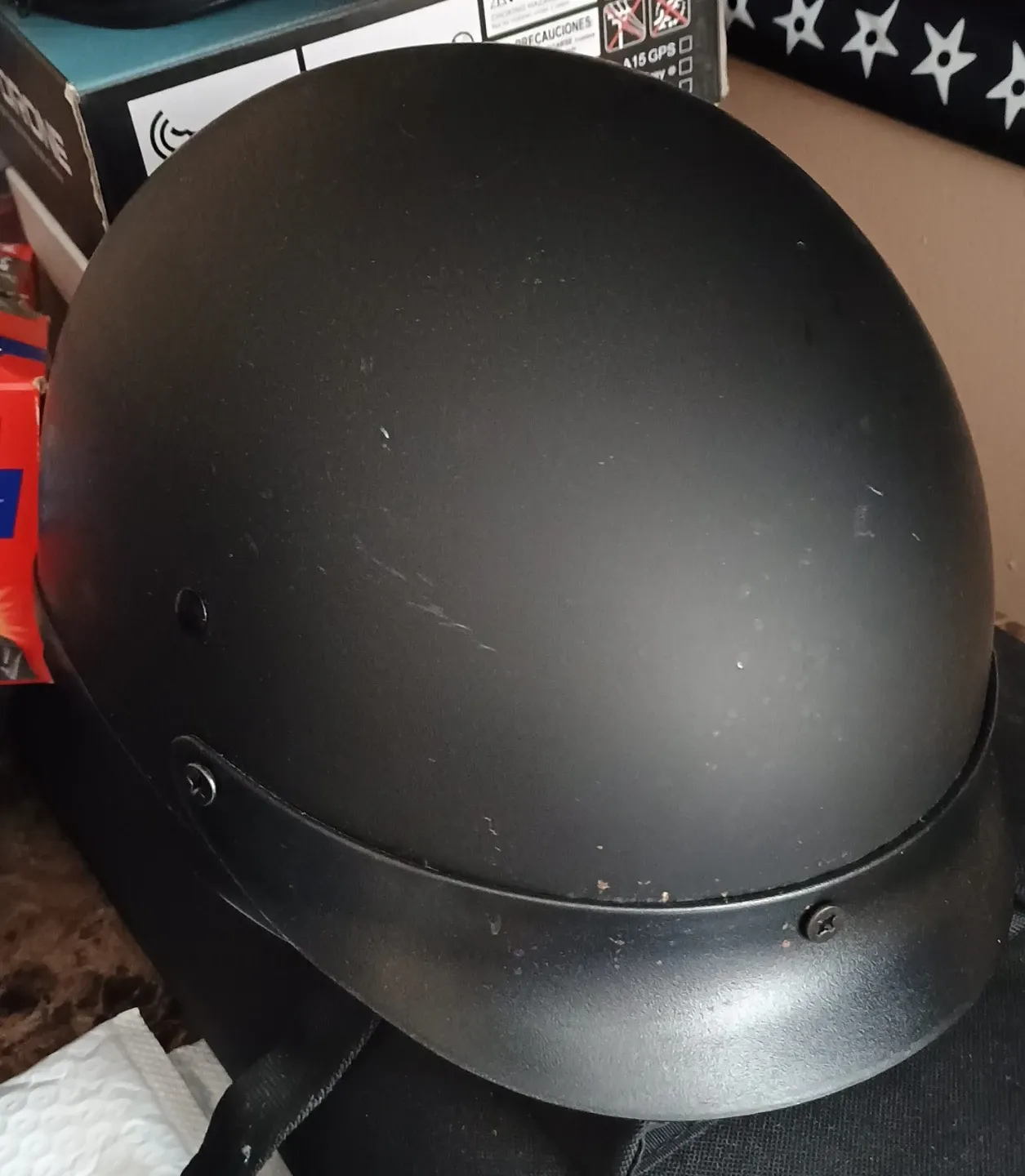 This black motorcycle helmet features a built-in visor for added protection. It has a comfortable blue interior lining and an adjustable chin strap for a secure fit. It's suitable for motorcycle riders looking for basic head protection.
