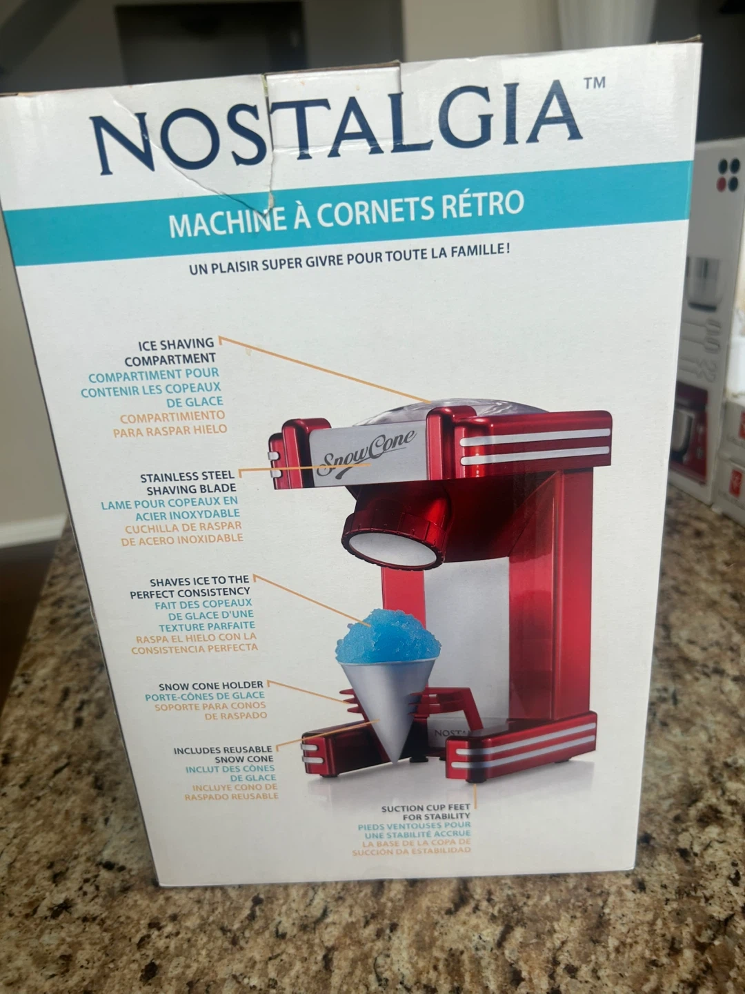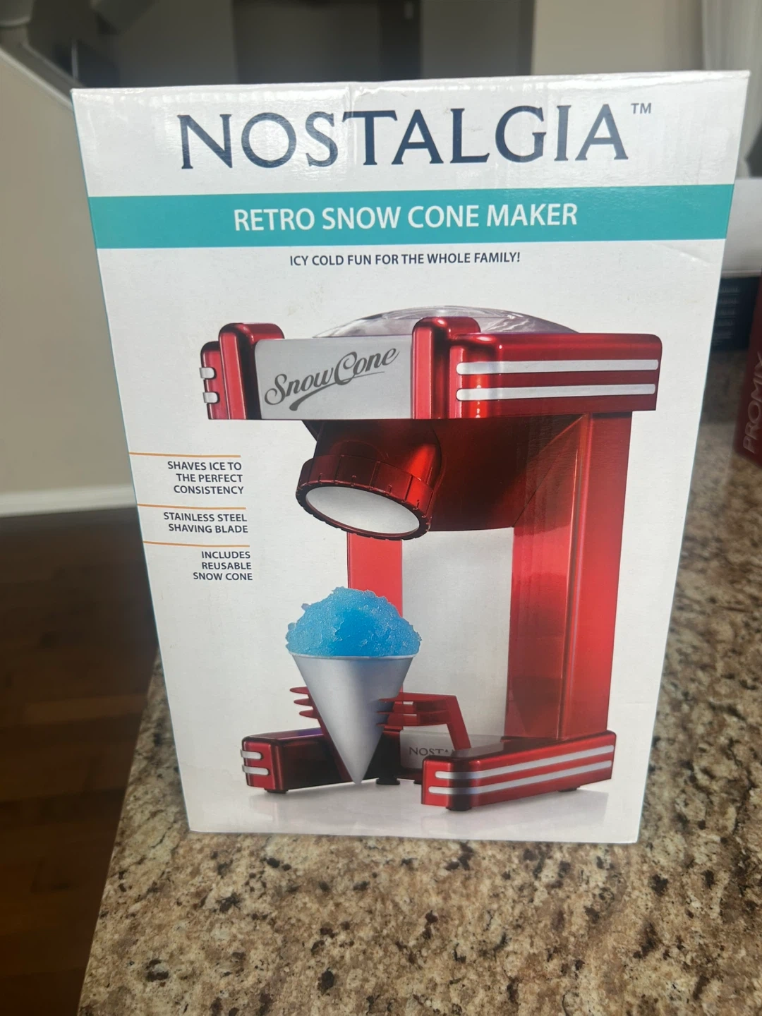 This Nostalgia Retro Snow Cone Maker shaves ice to a perfect consistency. It features a stainless steel shaving blade and It's icy cold fun for the whole family!