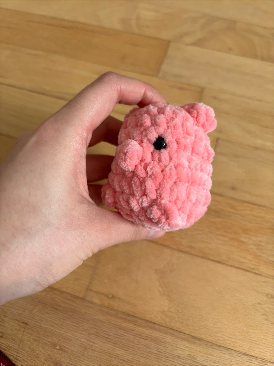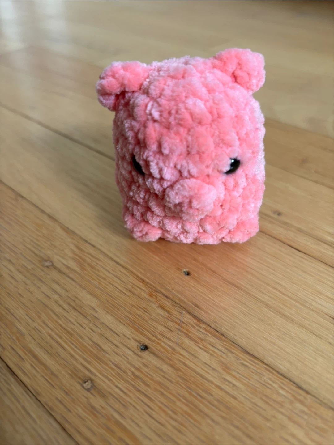 This is a cute, handmade crocheted pig toy. It's made from soft, chenille-style yarn and has black safety eyes. It's small enough to fit in your hand, perfect for a little desk buddy or a whimsical decoration. It's a lovely, plush pink colour!