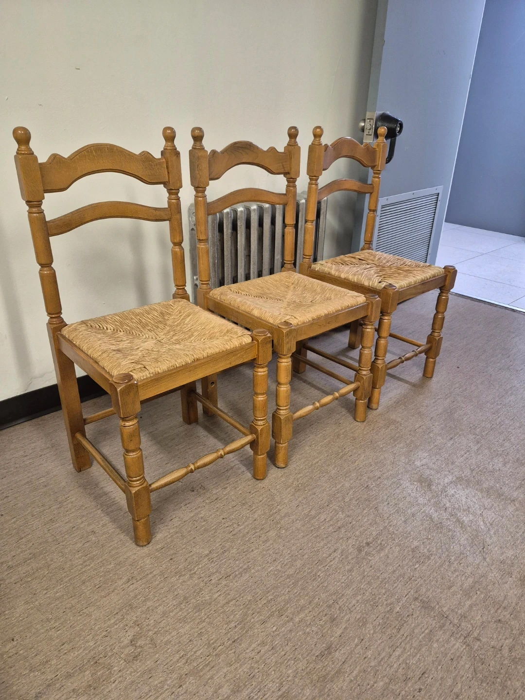 Three wooden chairs with natural woven rush seats. They have a classic ladder back design. These chairs would be great for a dining set or as accent chairs in a room. They're sturdy and ready for a new home!