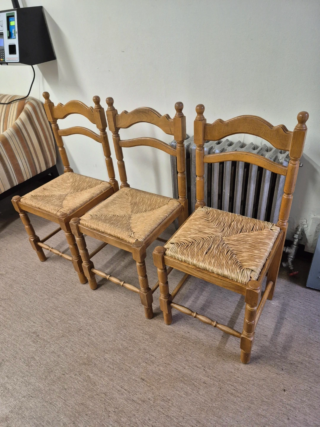 Three wooden chairs with natural woven rush seats. They have a classic ladder back design. These chairs would be great for a dining set or as accent chairs in a room. They're sturdy and ready for a new home!