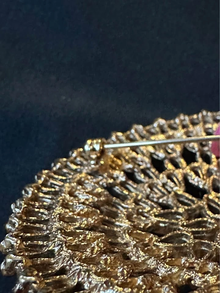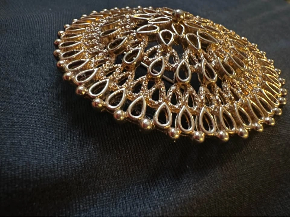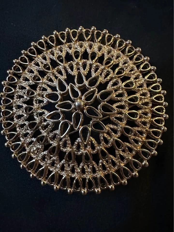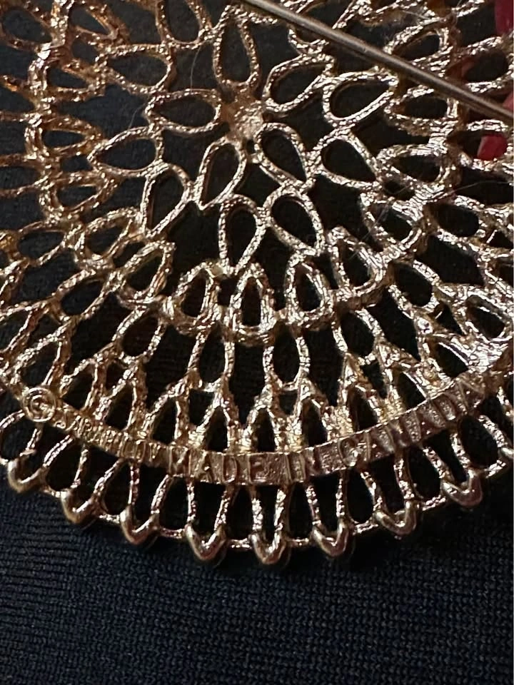 This is a stunning large gold medallion brooch, signed on the back by Sarah Coventry circa the 1960’s, made in Canada.
