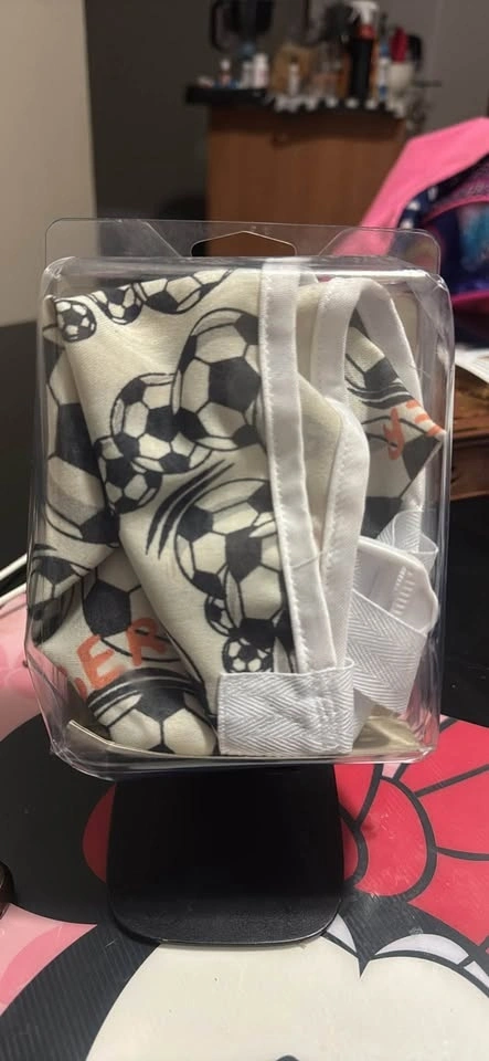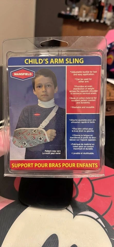 New Mansfield child's arm sling. Has an adjustable buckle for easy use, can be used for either arm. Made of comfy cotton material, washable and reusable. Features a cool soccer ball pattern.