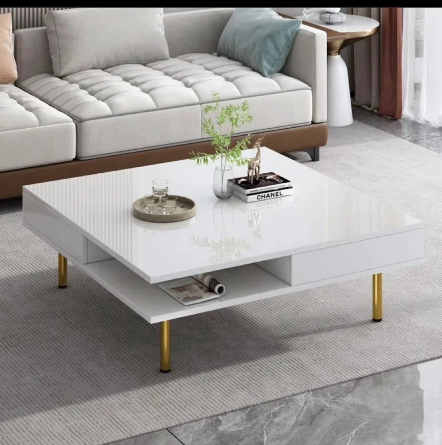 This square coffee table features a sleek white finish and multiple storage options. It includes two hidden drawers and open shelves for keeping remotes, magazines, and other small essentials tidy. The stylish gold legs add a touch of modern elegance to your living space. Perfect for a contemporary living room setup!