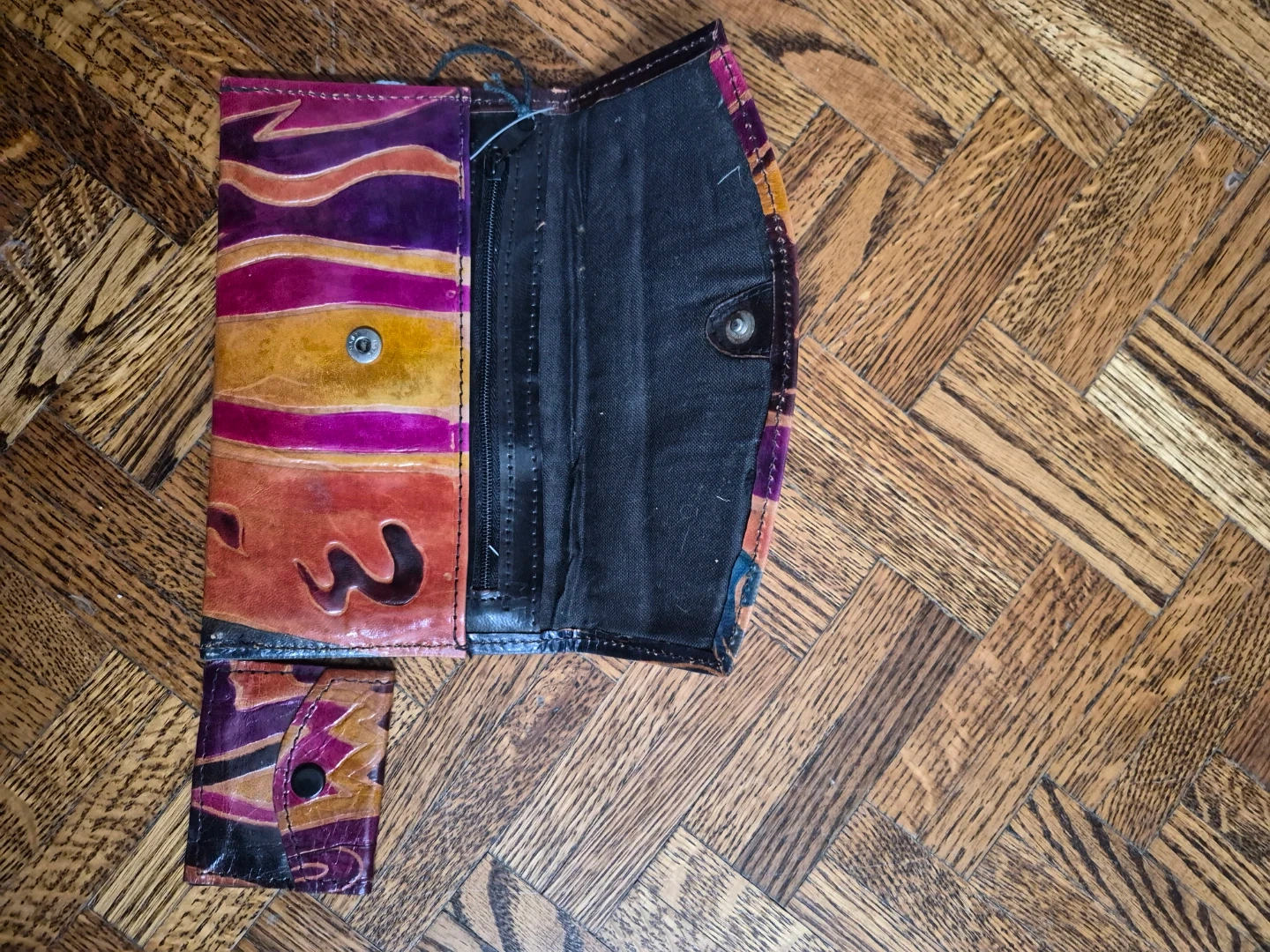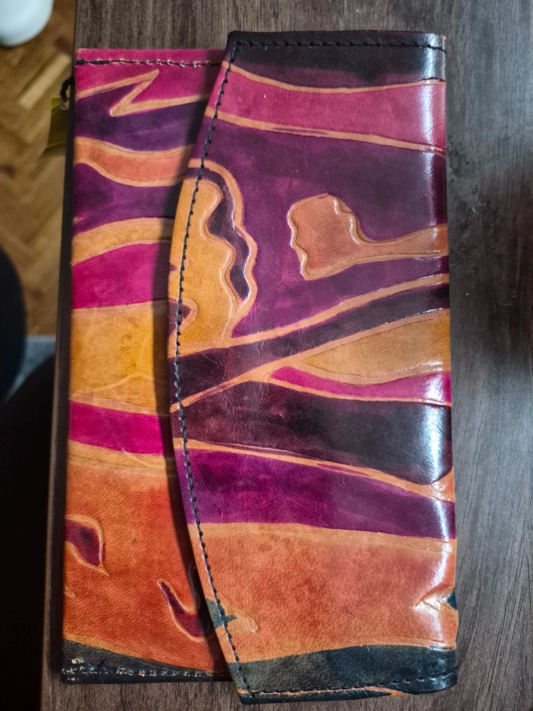 This set includes a clutch wallet and a matching coin purse. Both are made from genuine leather with a colourful abstract pattern. The wallet has a zip compartment inside.