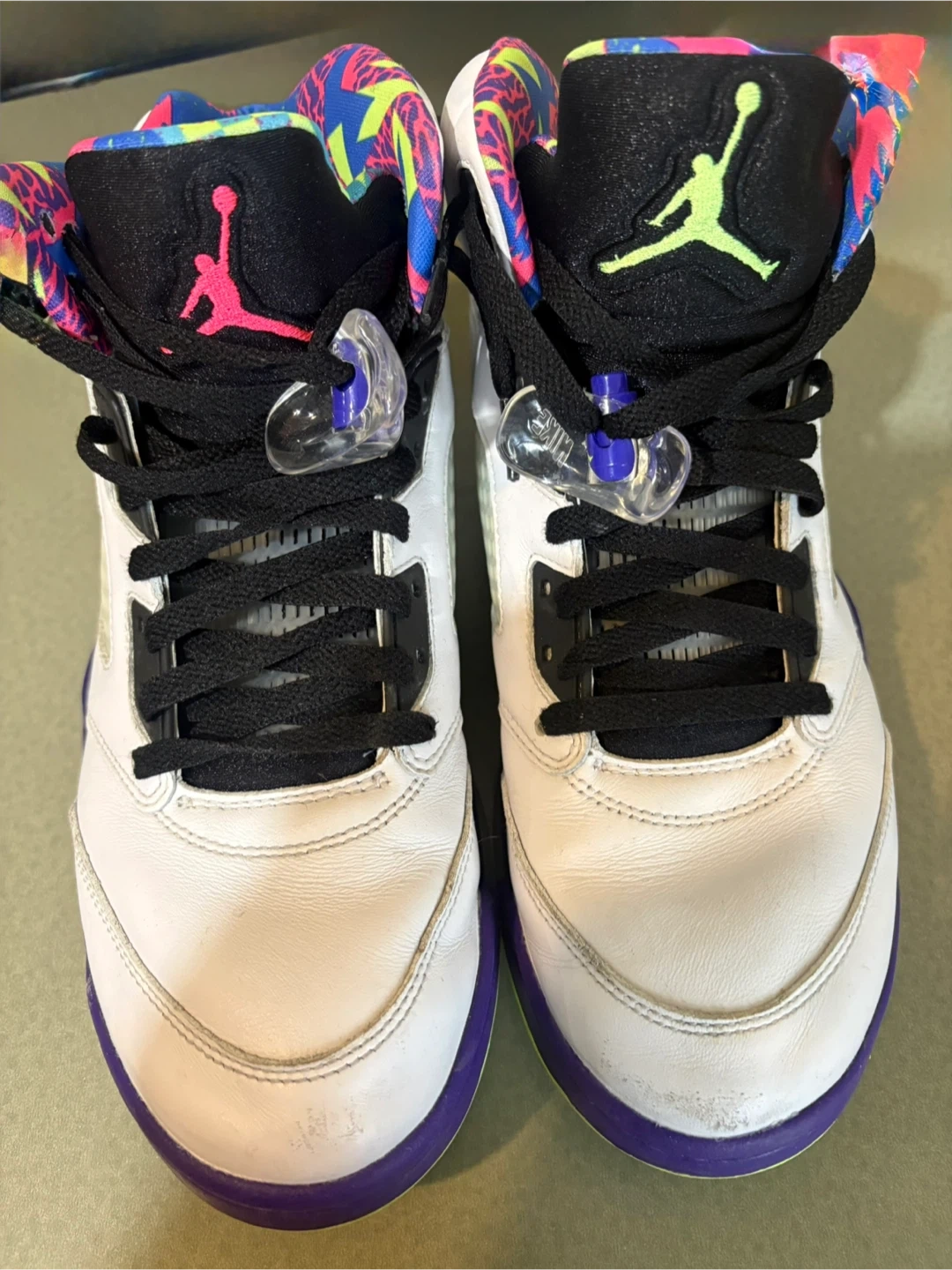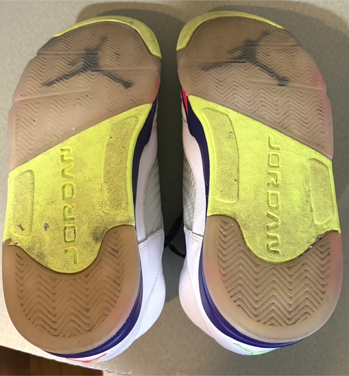 These Jordan 5 Retro sneakers come in a white leather with purple and neon accents. The shoes feature the iconic Jumpman logo on the tongue and sole. A cool, vibrant print lines the inside collar. Jordan 5 retro sneakers in good condition, used couple times, size 1 1, dm to buy without box. Cash only