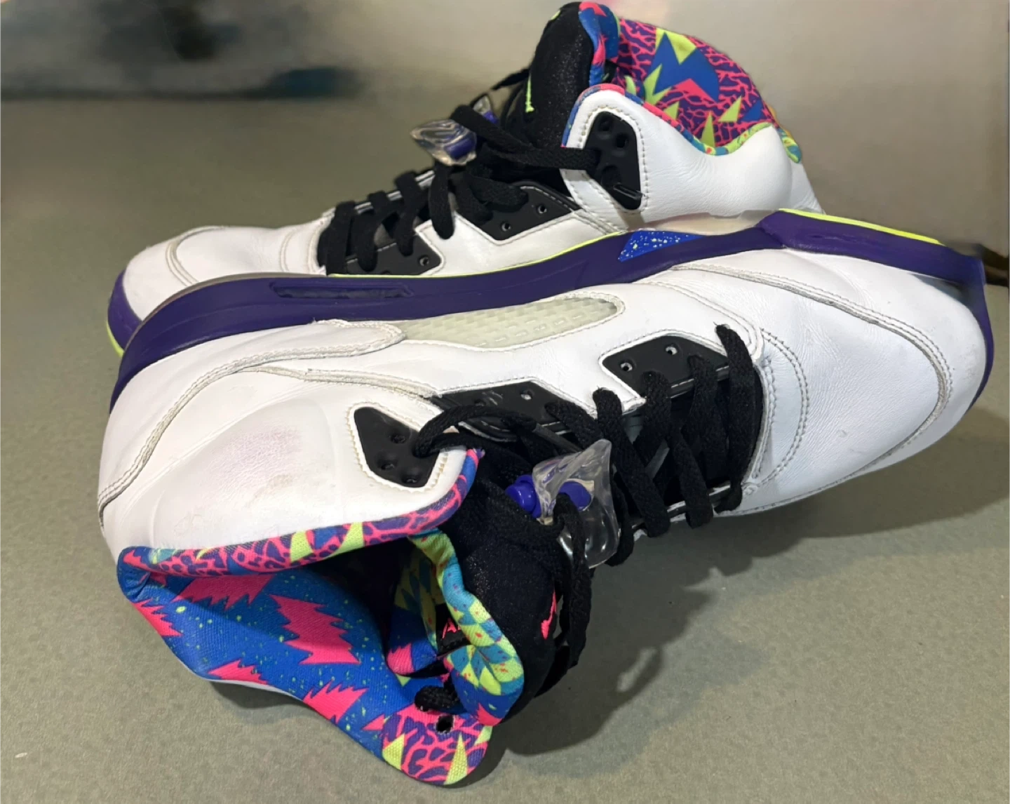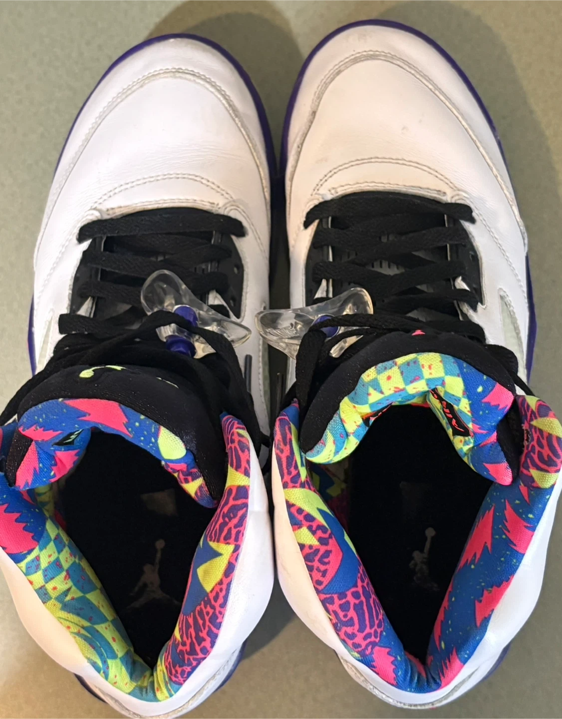 These Jordan 5 Retro sneakers come in a white leather with purple and neon accents. The shoes feature the iconic Jumpman logo on the tongue and sole. A cool, vibrant print lines the inside collar. Jordan 5 retro sneakers in good condition, used couple times, size 1 1, dm to buy without box. Cash only