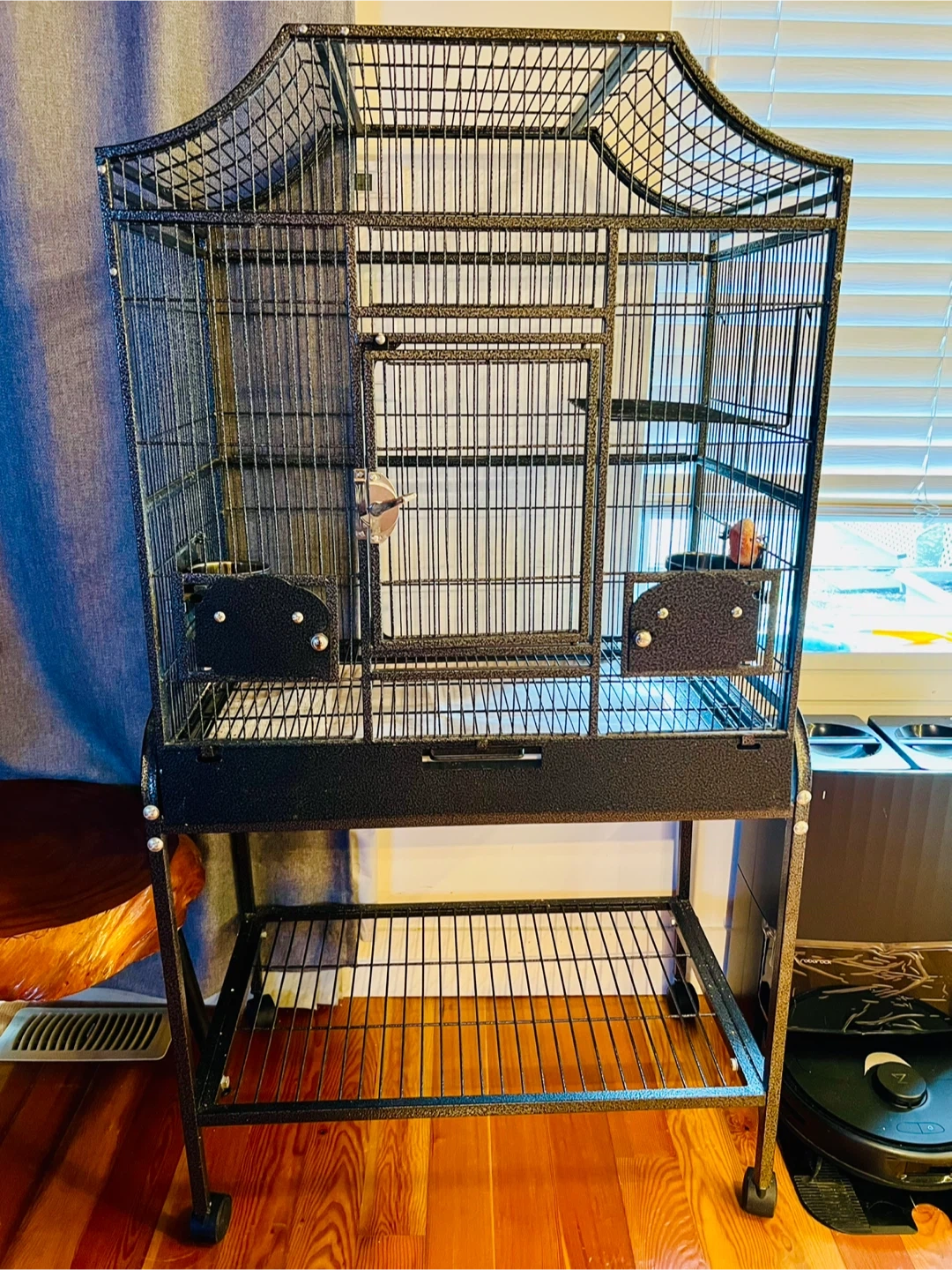 Spacious bird cage with a decorative arched top and a convenient stand. It includes feeders and perches inside. Features multiple doors for easy access. The bottom shelf provides extra storage. This cage is perfect for small to medium-sized birds.