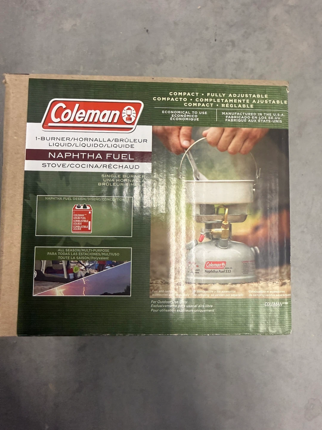 This is a Coleman single-burner naphtha fuel liquid stove. It's compact, fully adjustable, and economical to use. Manufactured in the U.S.A., it's suitable for all seasons and multi-purpose use.