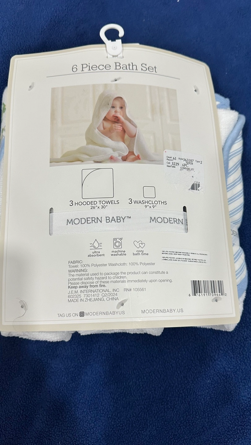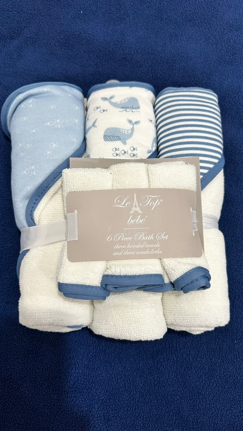 New baby bath set. Includes three hooded towels and three washcloths. Soft and absorbent. Perfect for newborns.