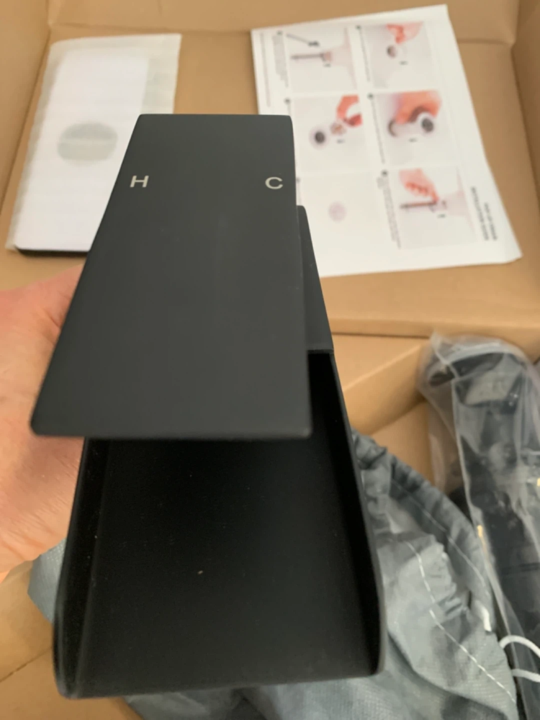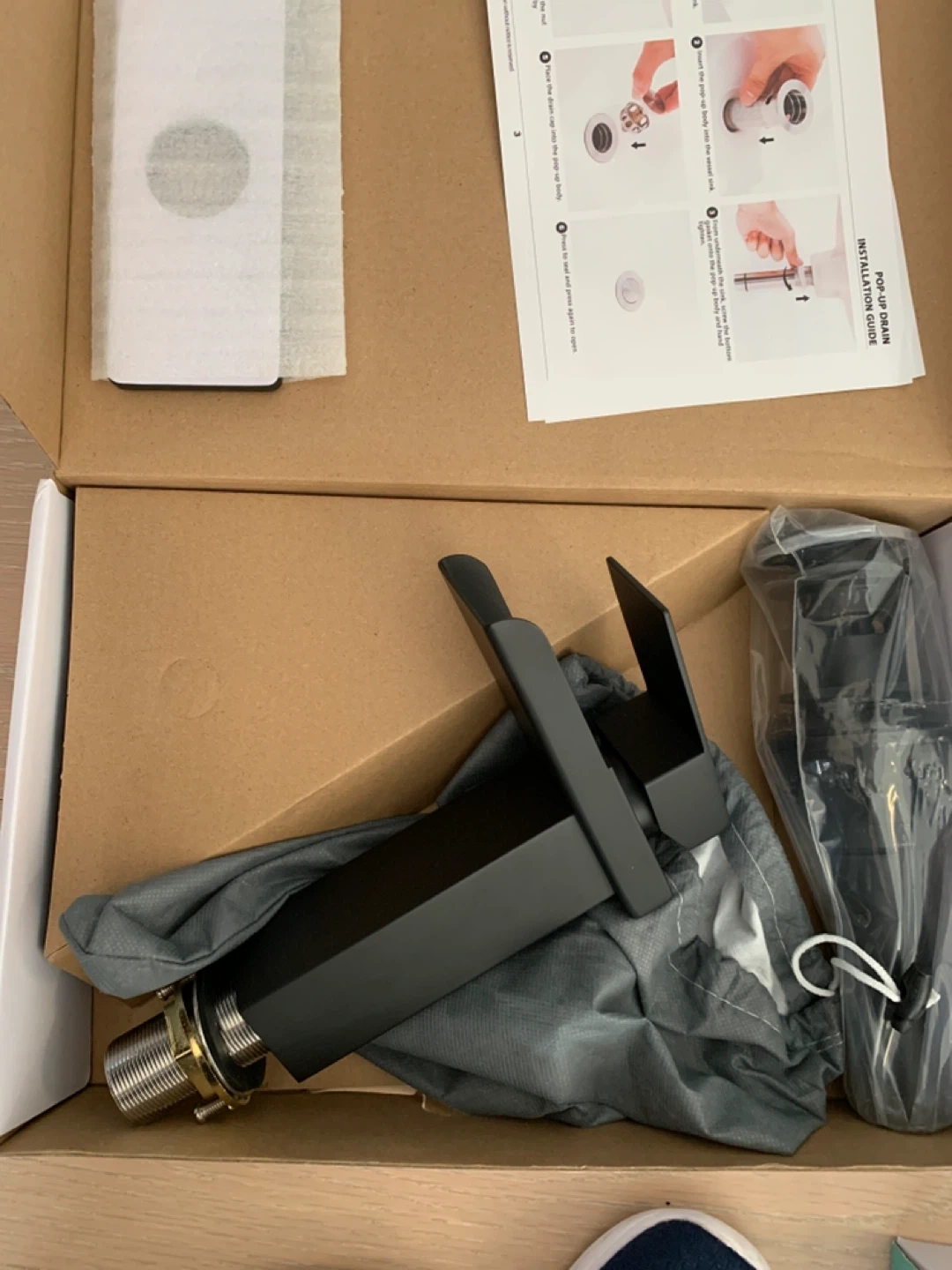 This is a new VSUNHOO matte black bathroom faucet. It includes the faucet, flexible hoses, and a pop-up drain assembly. Installation instructions are included in the box. It's designed for bathroom sinks.