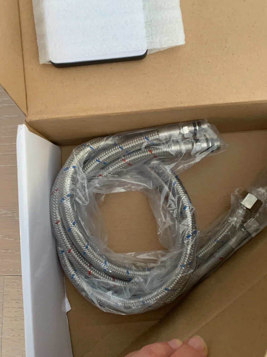 This is a new VSUNHOO matte black bathroom faucet. It includes the faucet, flexible hoses, and a pop-up drain assembly. Installation instructions are included in the box. It's designed for bathroom sinks.