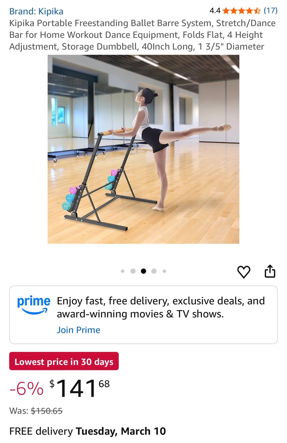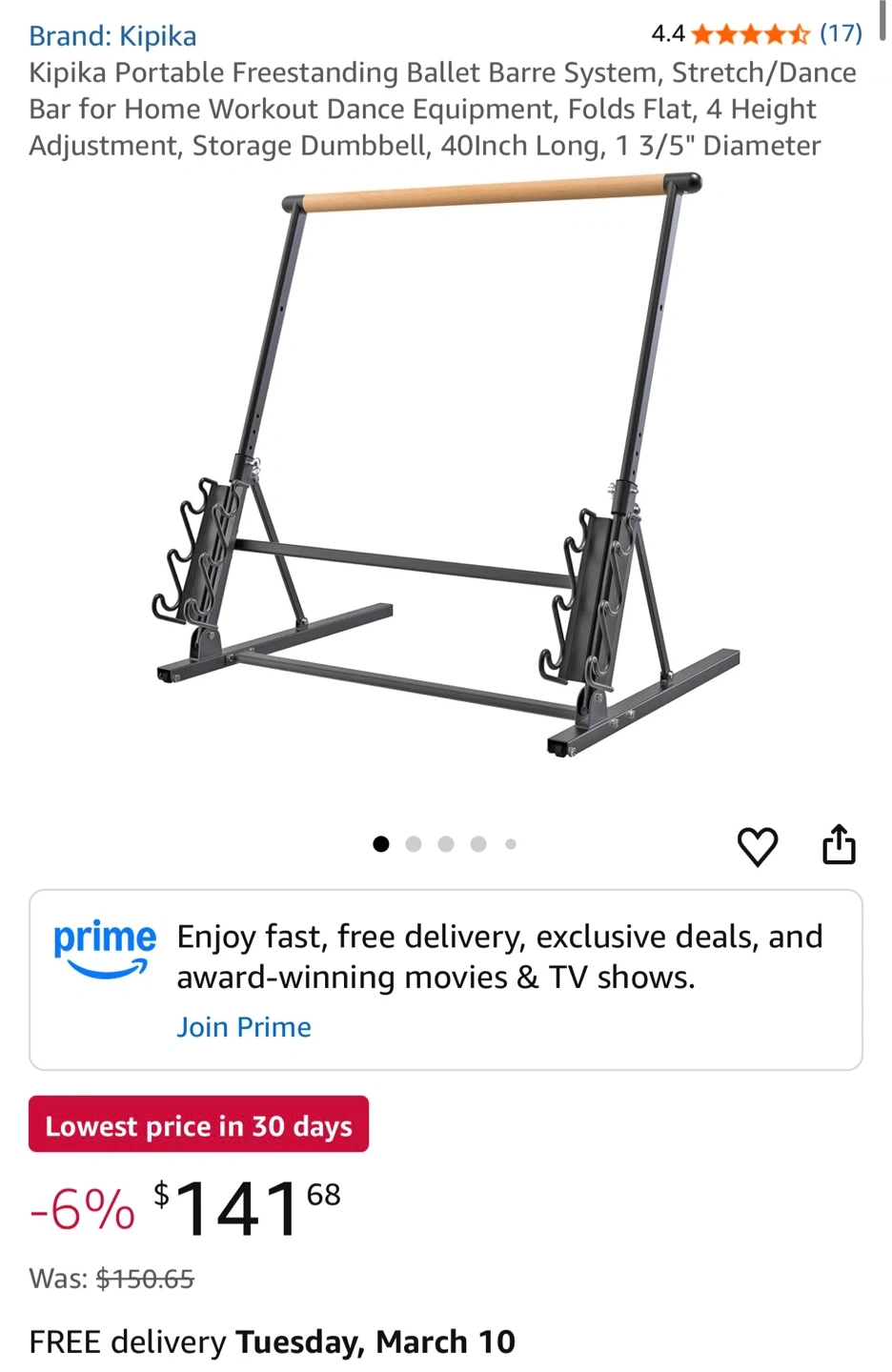 This Kipika portable freestanding ballet barre system is great for home workouts. It's designed for stretching and dance, and it folds flat for easy storage. The barre has 4 height adjustments and a 40-inch length with a 1 3/5-inch diameter.