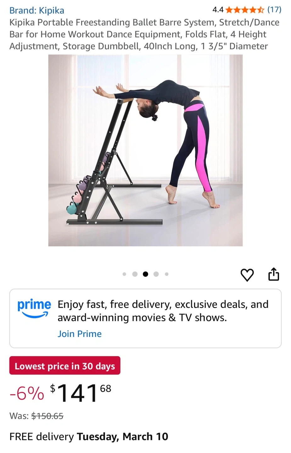 This Kipika portable freestanding ballet barre system is great for home workouts. It's designed for stretching and dance, and it folds flat for easy storage. The barre has 4 height adjustments and a 40-inch length with a 1 3/5-inch diameter.