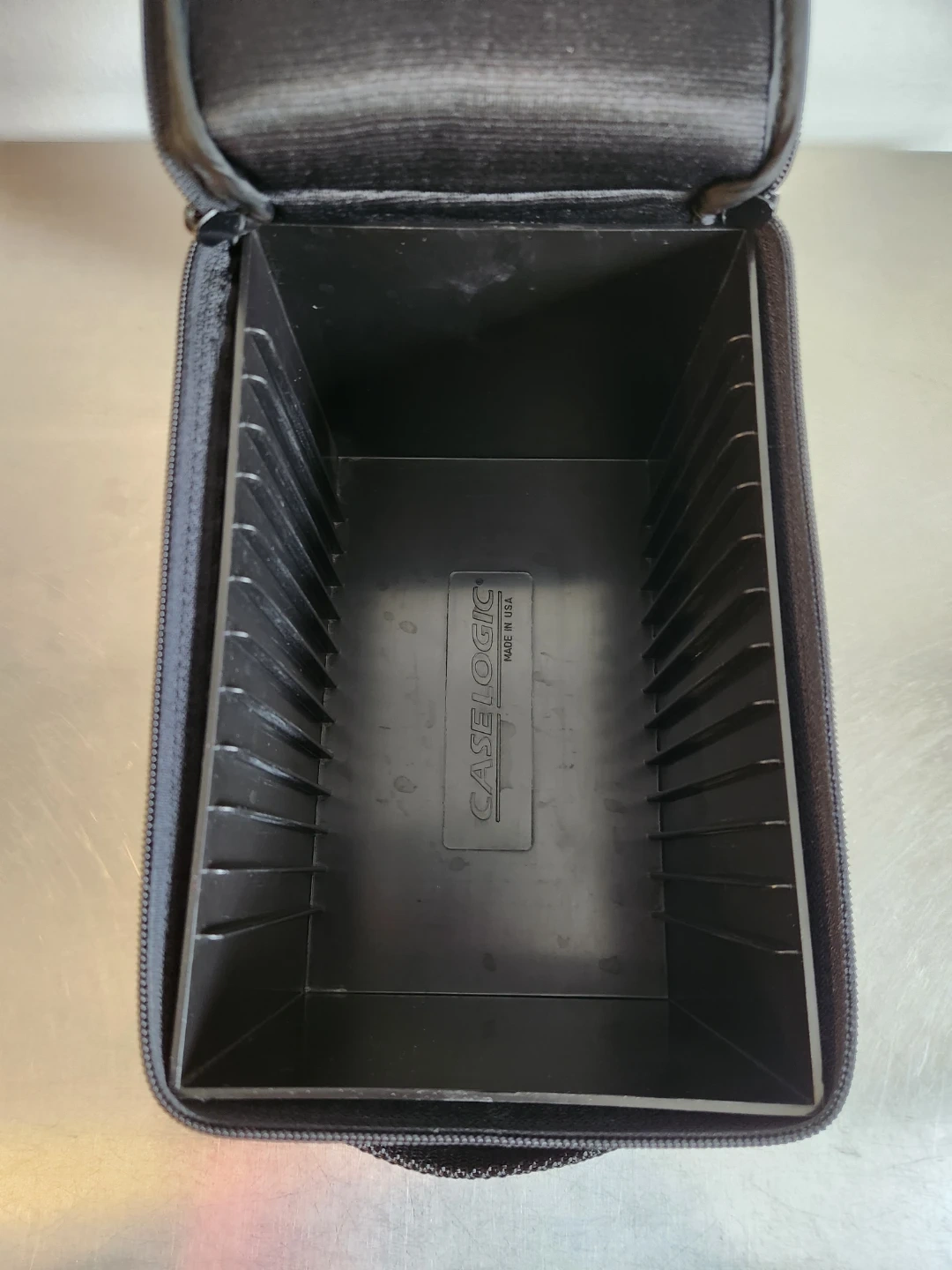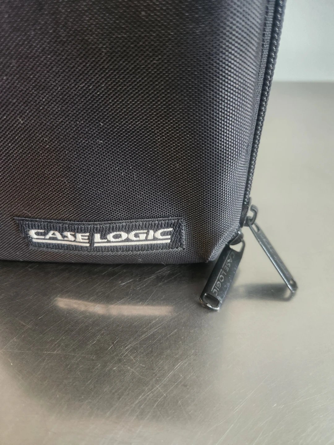 Black Case Logic carrying case with a front pocket and zippered closure. It has a nylon exterior and a fabric handle. Great for storing small electronics or accessories!
