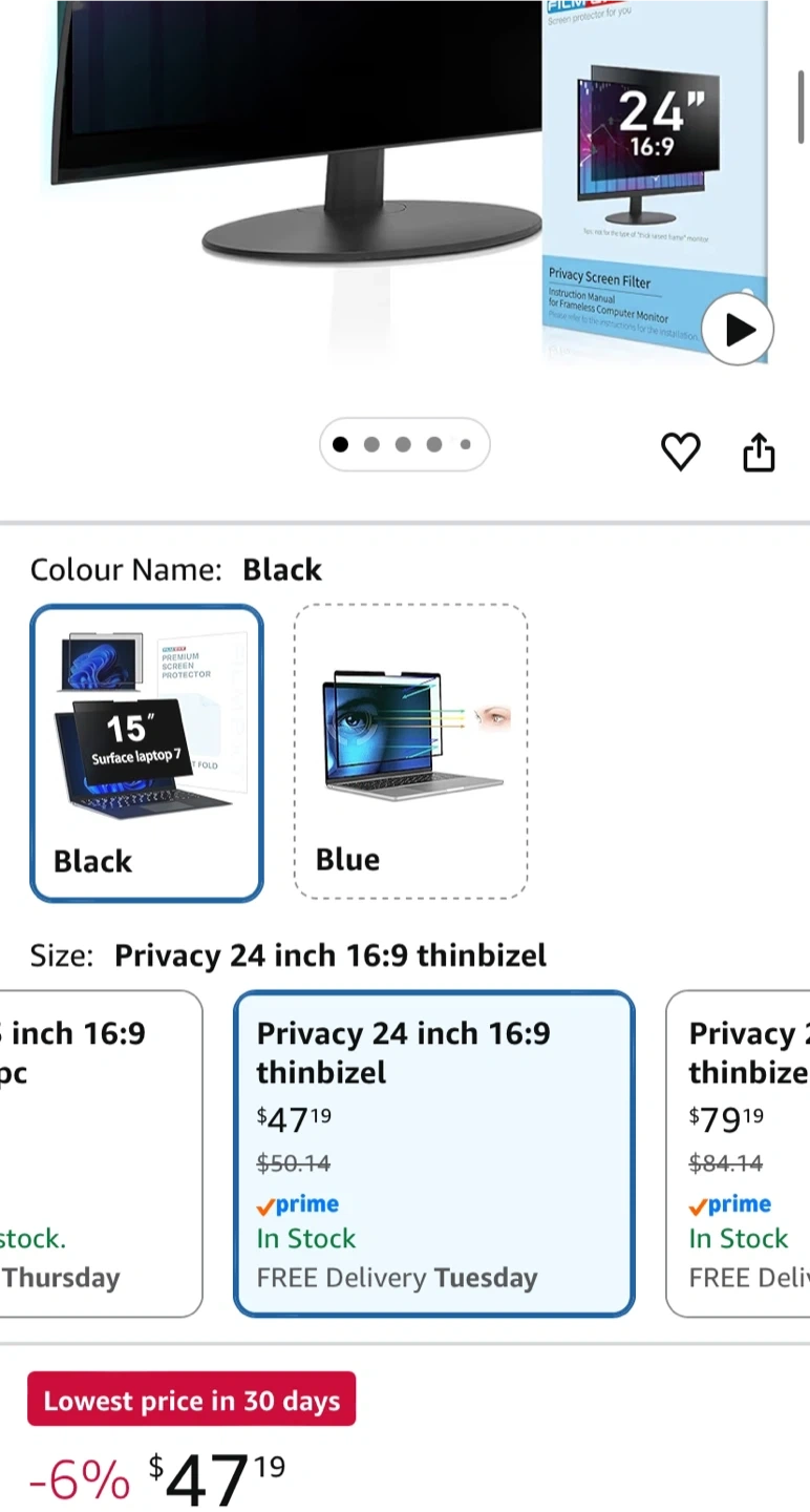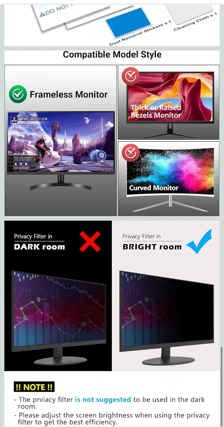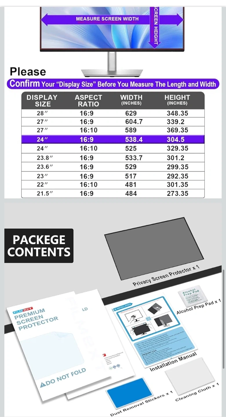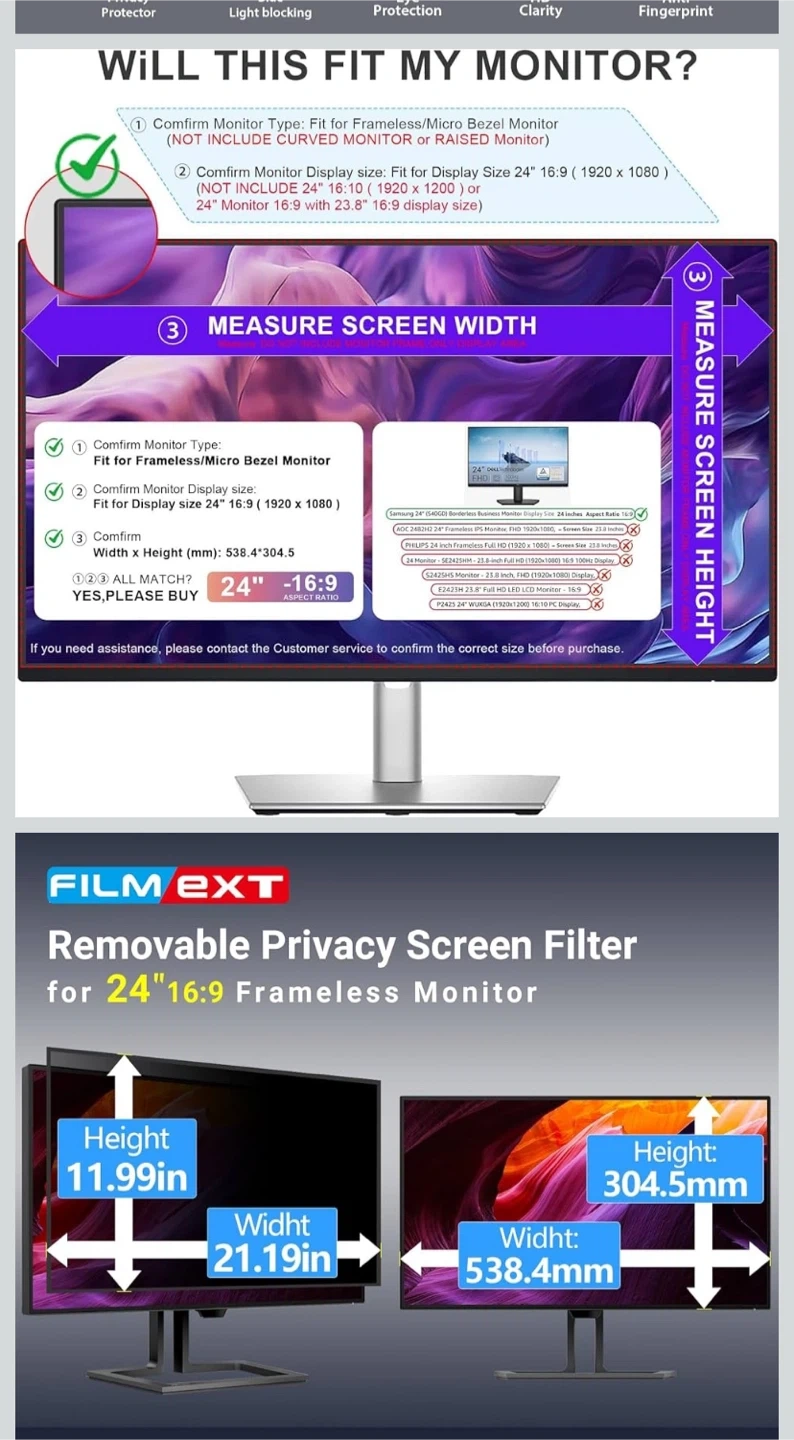 This FILM EXT premium screen protector is designed for 24-inch monitors with a 16:9 aspect ratio. It offers privacy protection, blue light blocking, and HD clarity. Installation is bubble-free with a silicone seal design. Includes privacy screen protector, alcohol prep pad, dust removal stickers, and cleaning cloth.