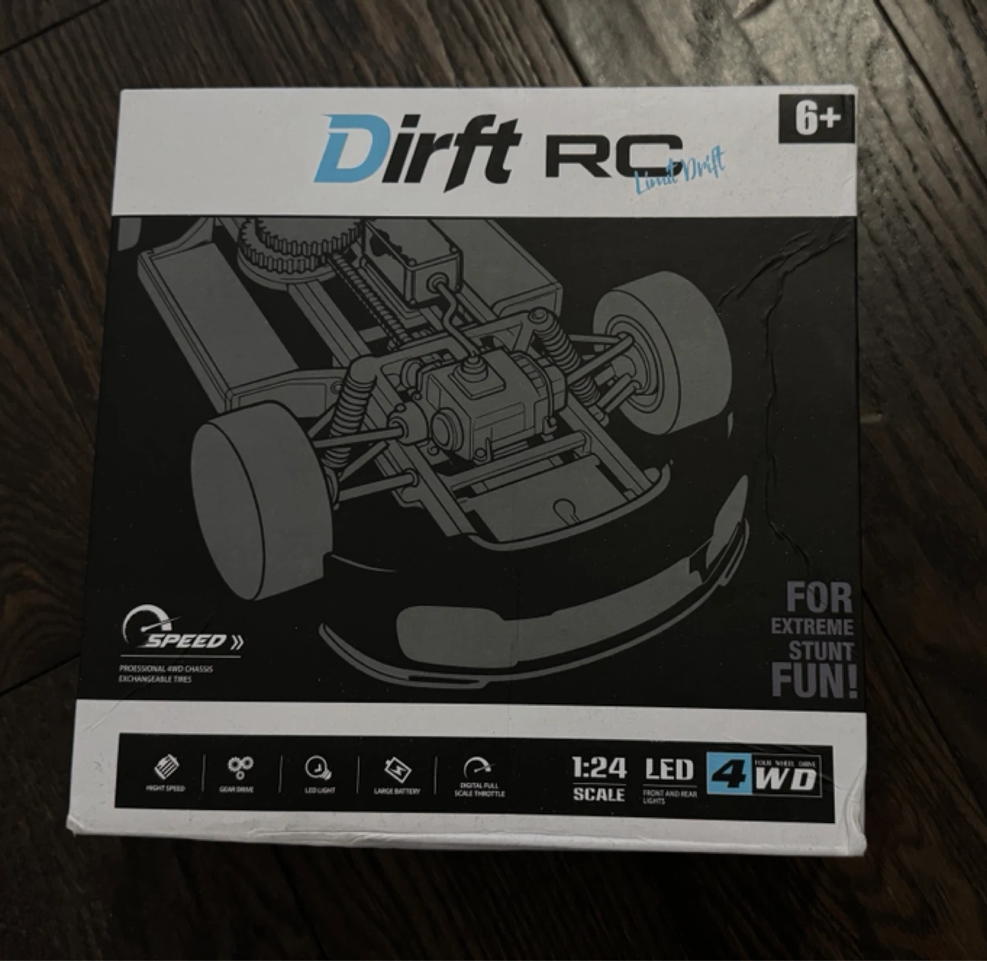 This Dirft RC car is a 1:24 scale model. It's a 4-wheel drive with LED lights and a digital proportional throttle. It comes with a remote control, extra tires, charging cable, and battery.