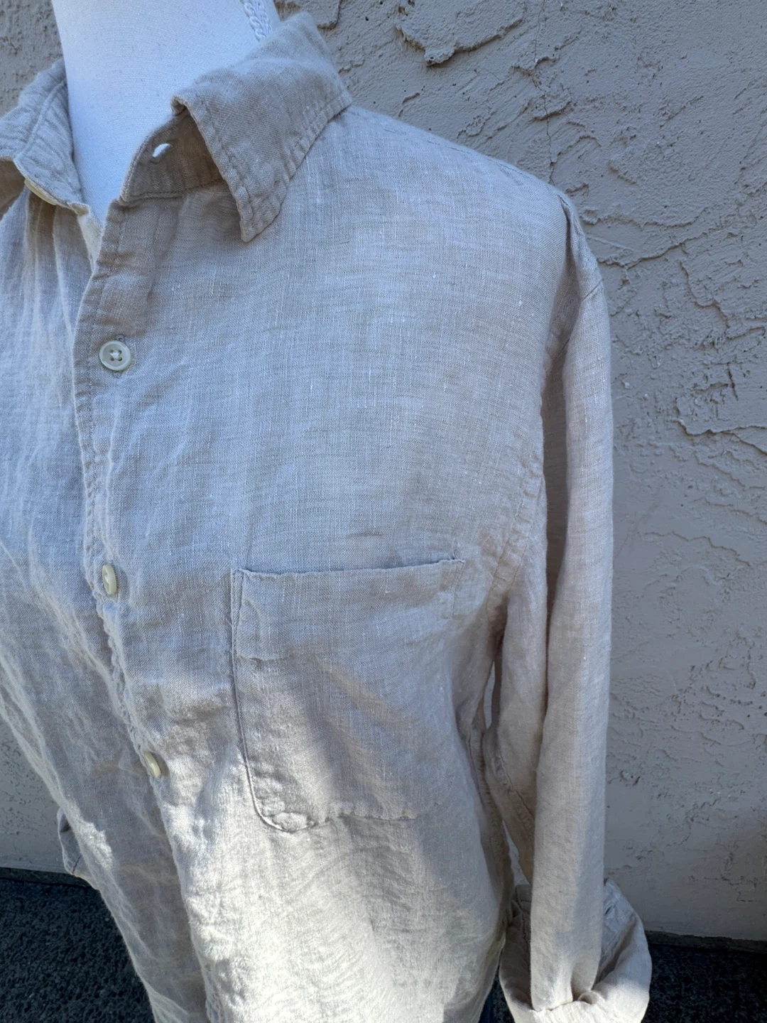 A casual button-up shirt made from breathable linen. It features a collared neckline and a single chest pocket. This shirt's relaxed fit makes it comfortable for warmer days.