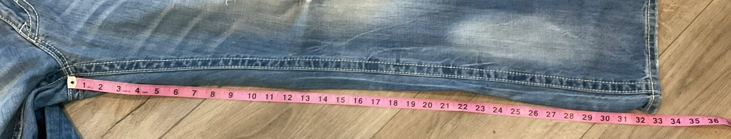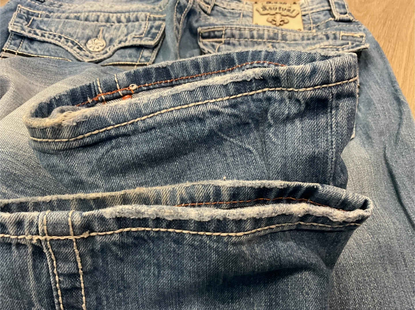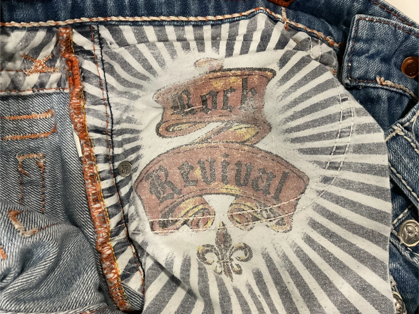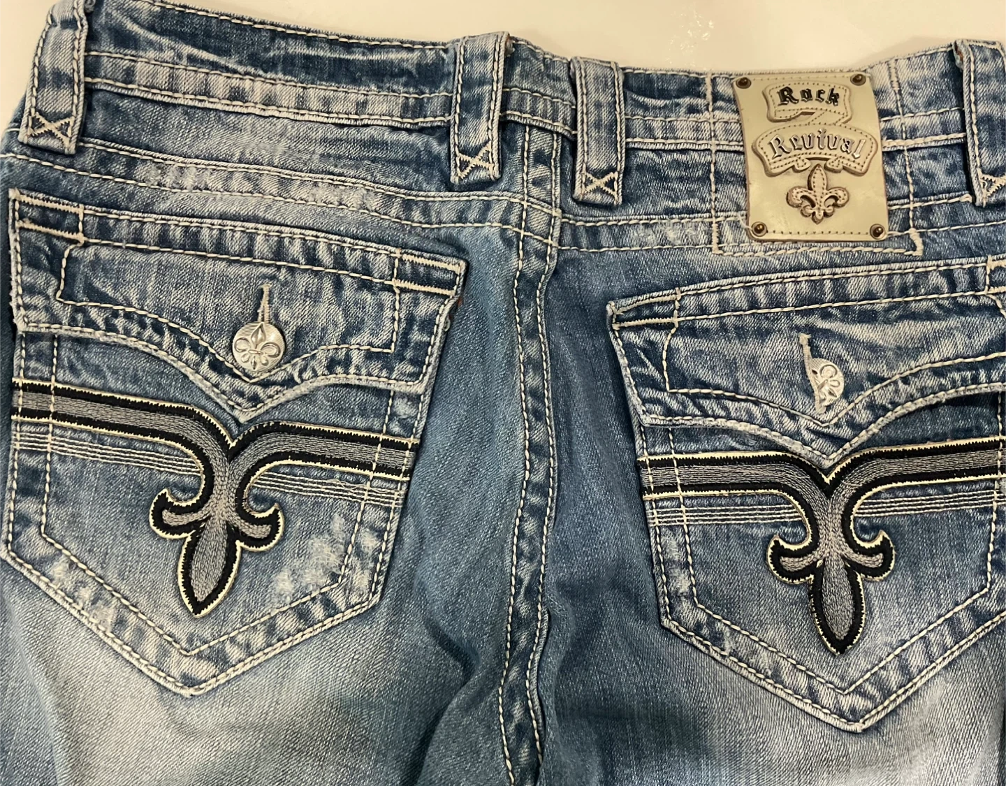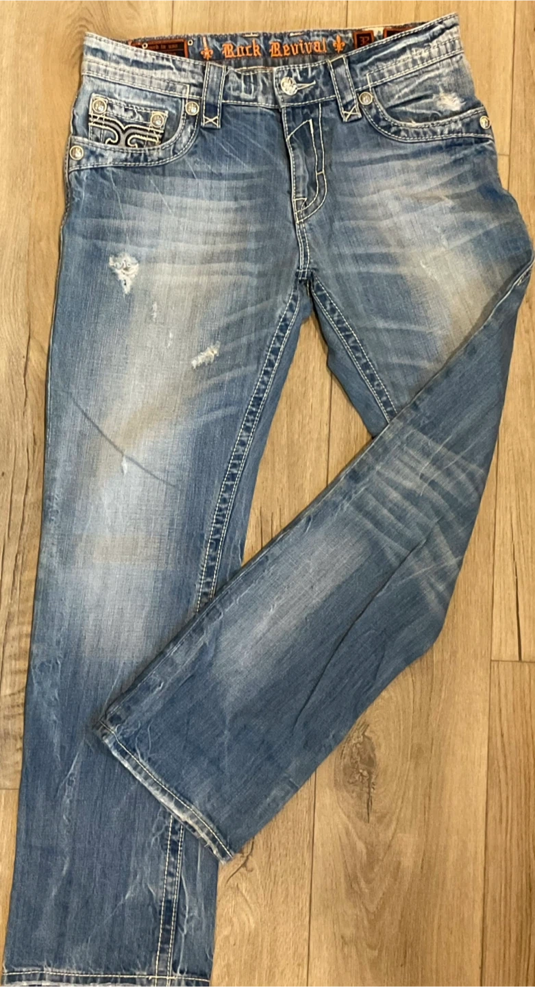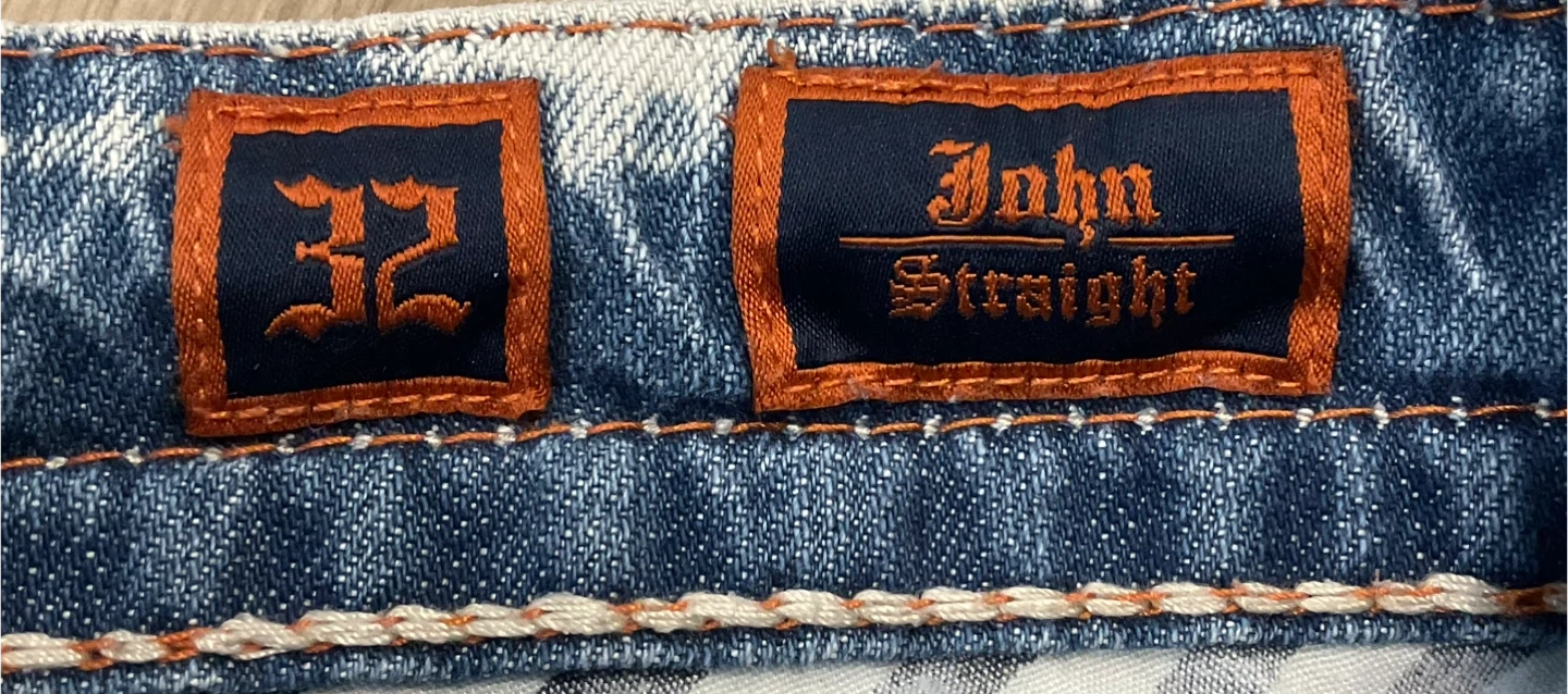 These are Rock Revival John Straight denim jeans. Size 32. They feature a classic blue wash with some distressing. These jeans offer a straight leg fit.