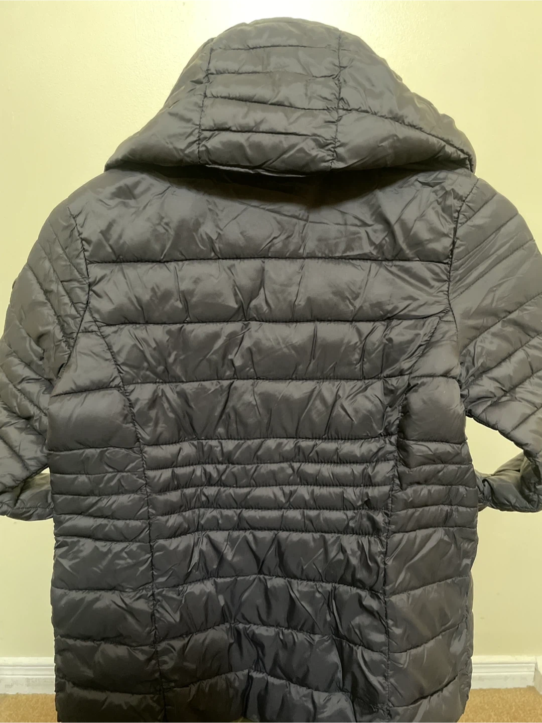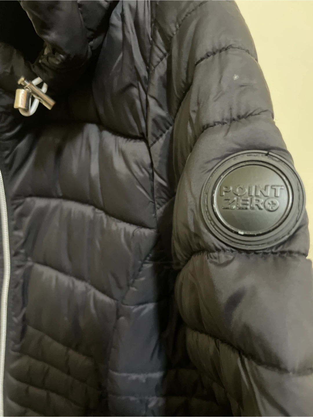 This is a black puffer jacket from Point Zero. It features a full zip closure and a hood. The jacket has zippered pockets on the sides.