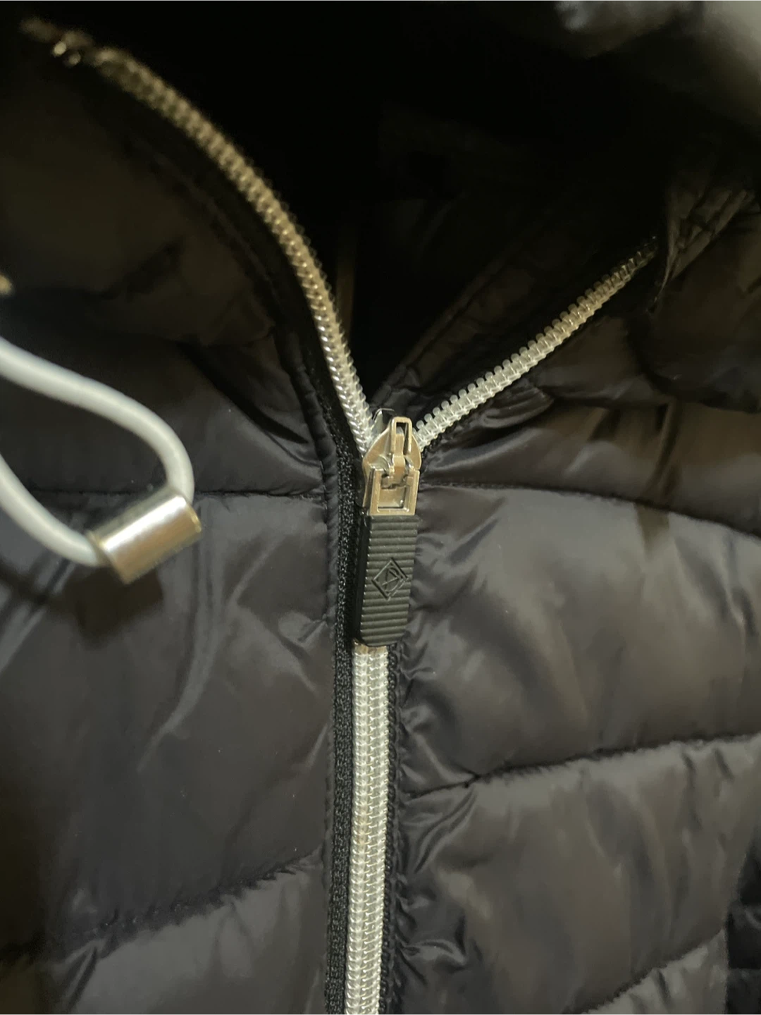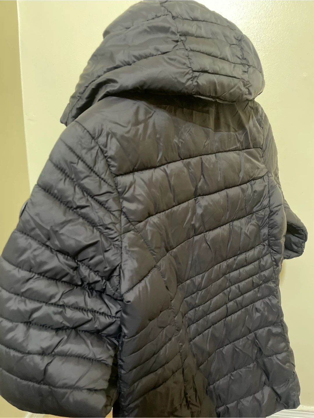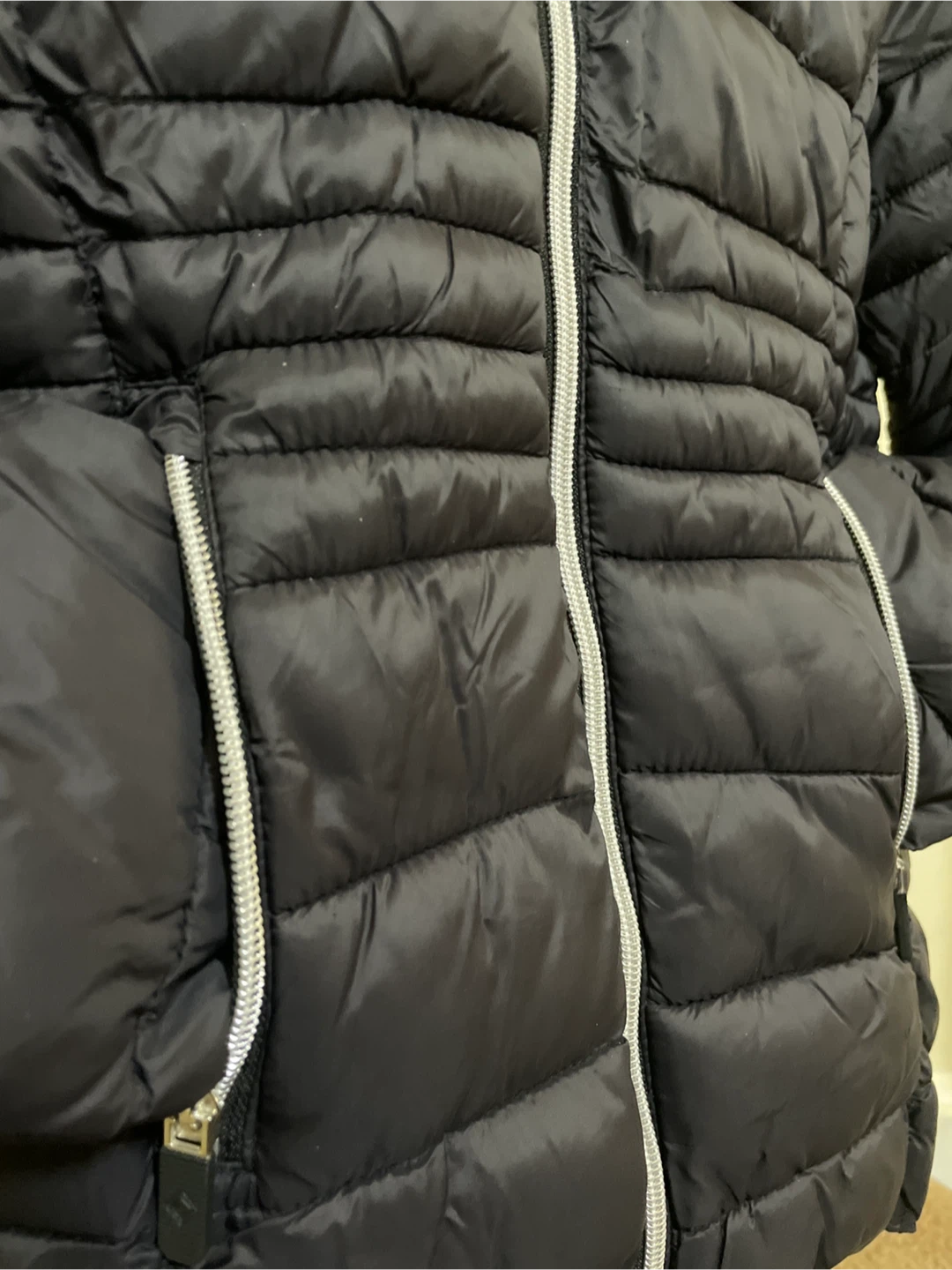 This is a black puffer jacket from Point Zero. It features a full zip closure and a hood. The jacket has zippered pockets on the sides.